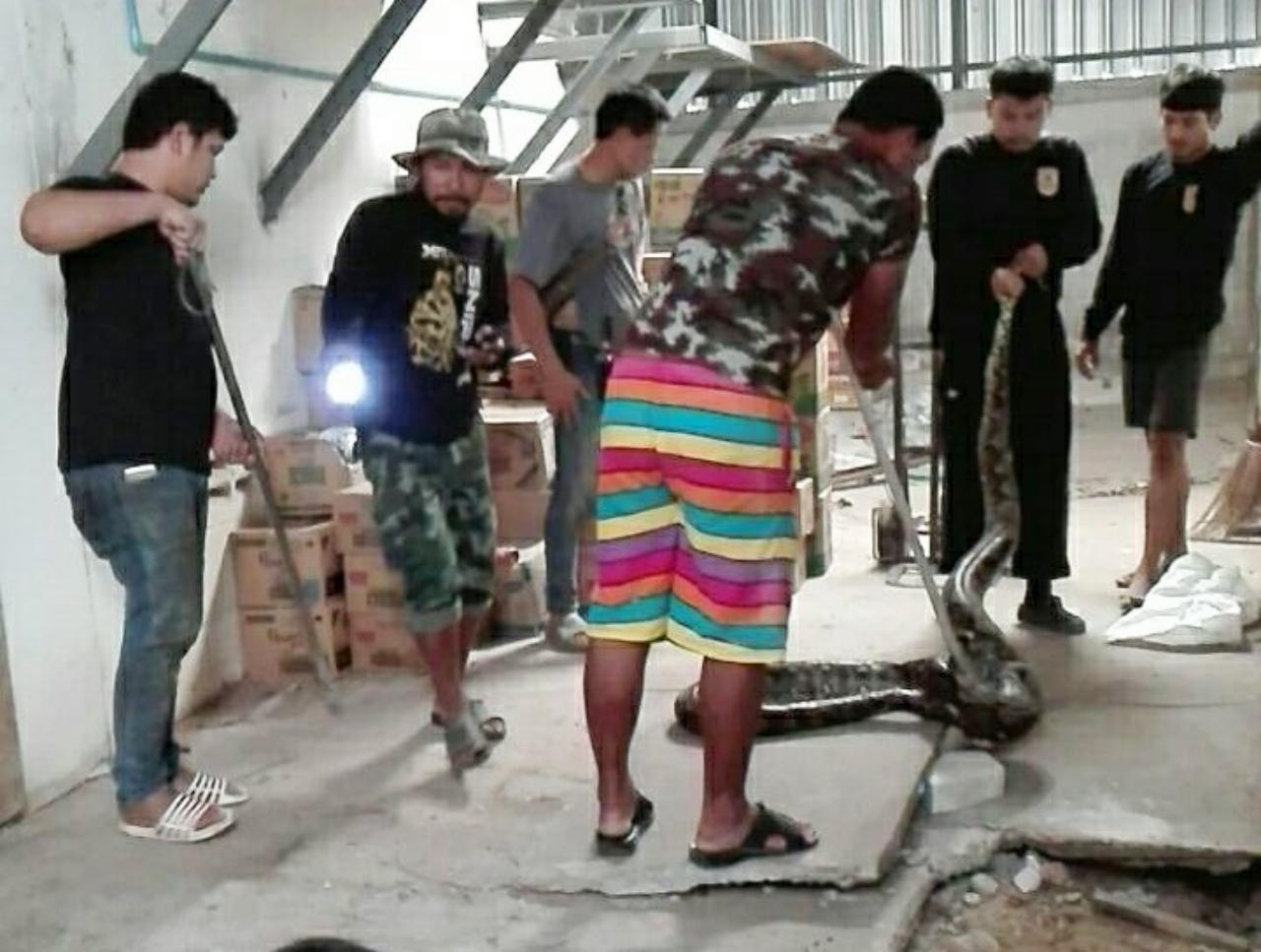 จากนั้น นายสินชัย เอี่ยมสว่าง หัวหน้าชุดกู้ภัยบางแก้วพร้อมกำลังจำนวน 5 นาย ได้รุดไปตรวจสอบ พบเป็นงูเหลือมขนาดใหญ่ นอนขดตัวอยู่ในโพรงใต้พื้นโกดัง จึงต้องใช้ค้อนปอนด์ทุบพื้นออก ใช้เวลาประมาณ 15 นาที จึงสามารถใช้อุปกรณ์จับงูคล้องหัวนำตัวออกมาได้ พบว่าเป็นงูเหลือมขนาดใหญ่ ความยาวประมาณ 4.5 เมตร หนักกว่า 50 กก.