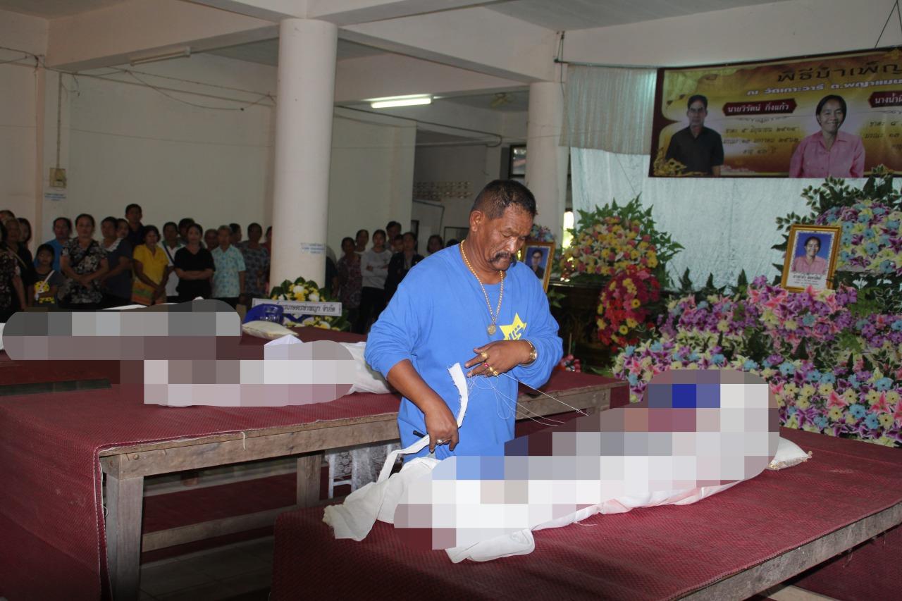สำหรับในงานวันนี้ ช่วงเช้าเมื่อเวลา 08.00 น. ทางญาติได้มีพิธีทำบุญเลี้ยงพระ และในเวลาช่าง เวลา 15.00 น. ที่เมรุวัดบ้านดง หมู่ 3 ต.พญาแมน อ.พิชัย จะมีพิธีฌาปนกิจศพ 2 ศพ คือ นางน้ำผา อินทร์สิทธิ์ อายุ 48 ปี พี่สาวฝาแฝดของนางน้ำผึ้ง และนางกนกวรรณ อินทร์สิทธิ์ อายุ 53 ปี พี่สาวของนางน้ำผึ้ง ก่อน และเวลาประมาณ 16.00 น. จะมีพิธีฌาปนกิจศพ โดยมีญาติและเพื่อนบ้านร่วมใจกันทำเชิงตะกอนแบบโบราณ เพื่อเผาศพ อีก 3 ราย ที่วัดเกาะวารี หมู่ 2 ต.พญาแมน อ.พิชัย จ.อุตรดิตถ์ ซึ่งประกอบไปด้วย นายวิรัตน์ กิ่งแก้ว อายุ 48 ปี พ่อตา นางกัญญาภัทร กิ่งแก้ว อายุ 28 ปี ลูกสาว ซึ่งเป็นภรรยาของนายธีรพล และนางน้ำผึ้ง อินทร์สิทธิ์ อายุ 48 ปี แม่ยาย โดยในงาน นายมานิต อนรรฆมาศ รอง ผวจ.อุตรดิตถ์ มาเป็นประธานในงานดังกล่าว