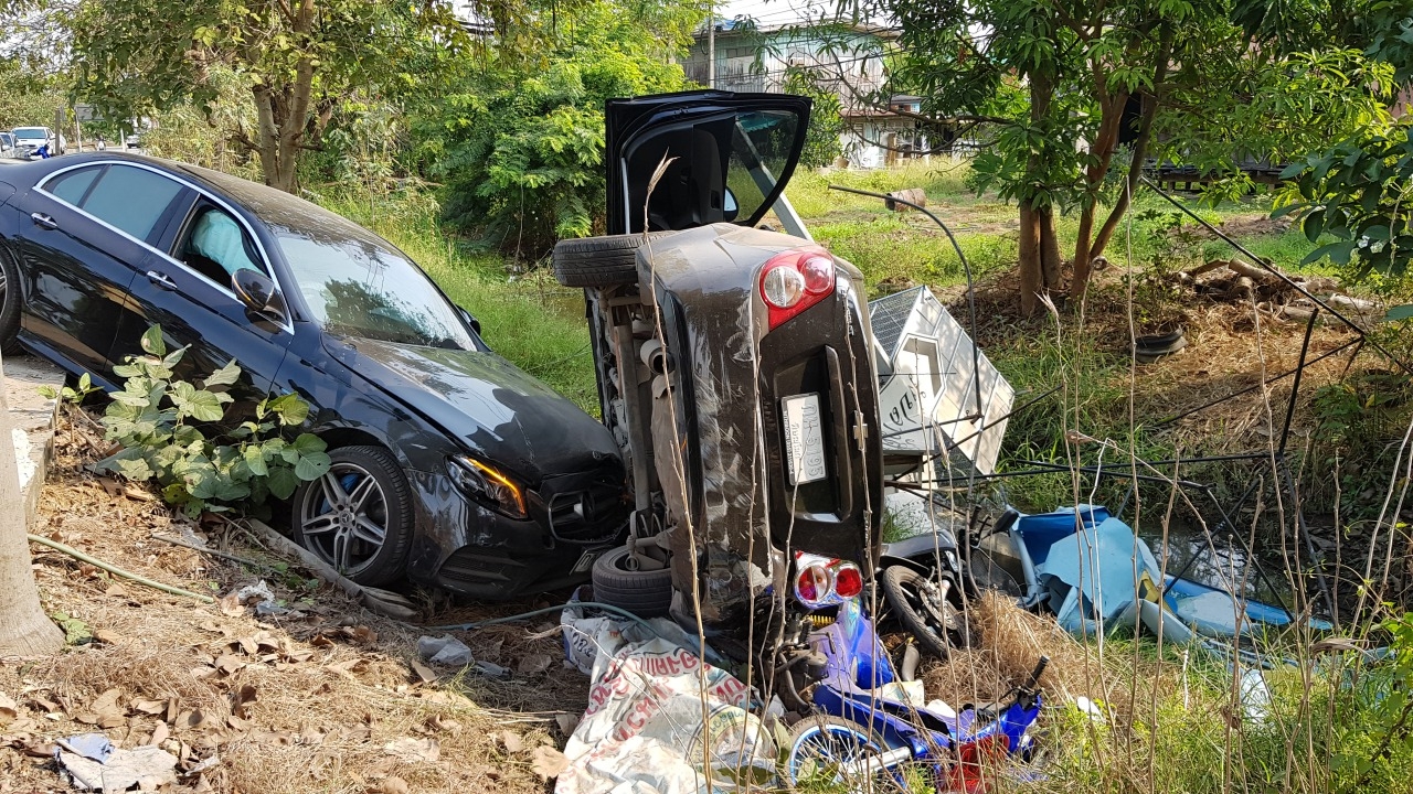 อดีต ผอ.รพ.พิจิตร ขับเบนซ์ตามหลังรถเก๋งสาวพิษณุโลก เห็นขับส่ายไปมาก่อนหักมาขวางช่องทางที่วิ่งมา จึงเบรกไม่ทัน ชนจนรถพลิกตะแคงไปโดนร้านขายกรงสุนัขริมทาง ข้างทางสาวคนขับเจ็บ...