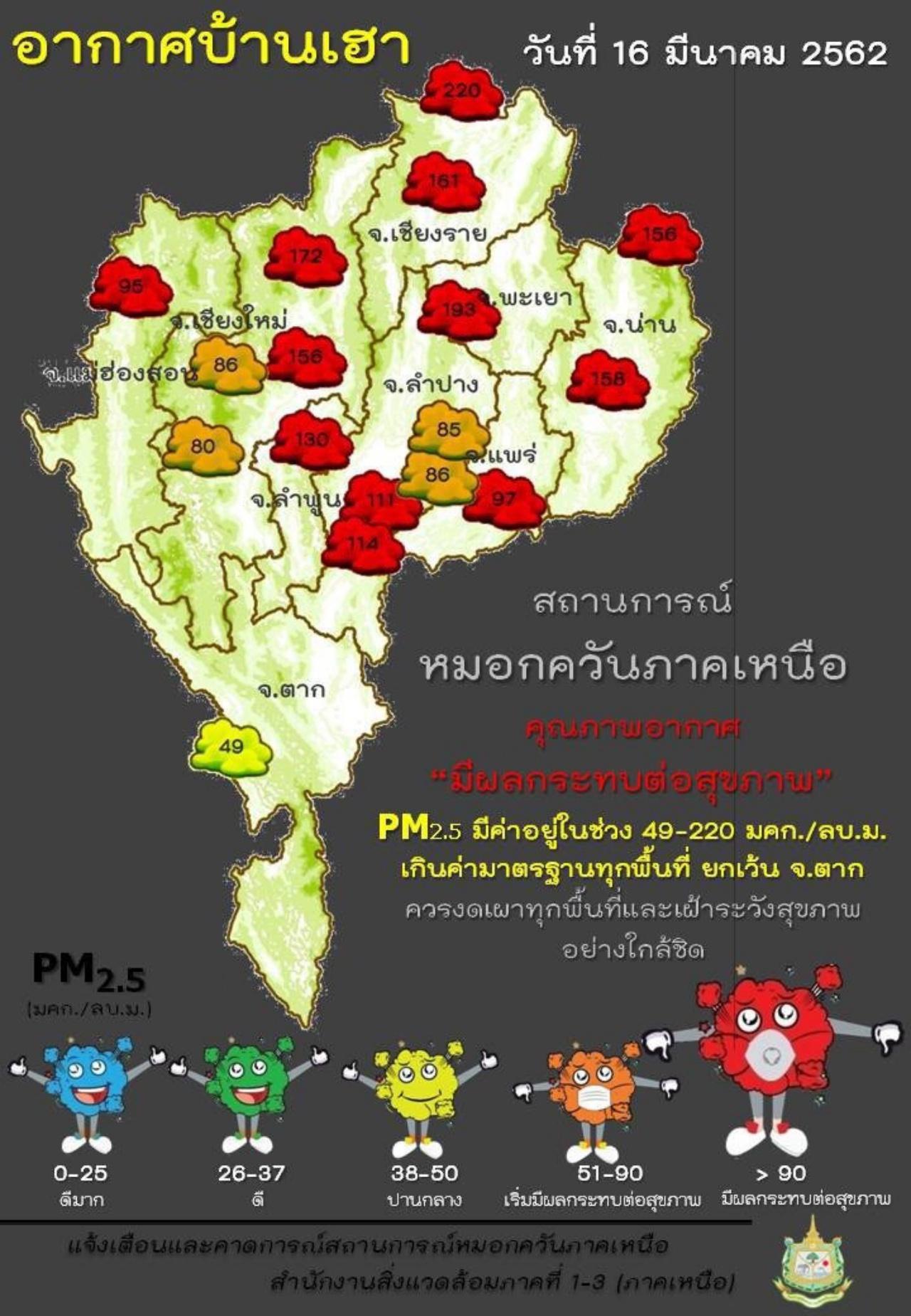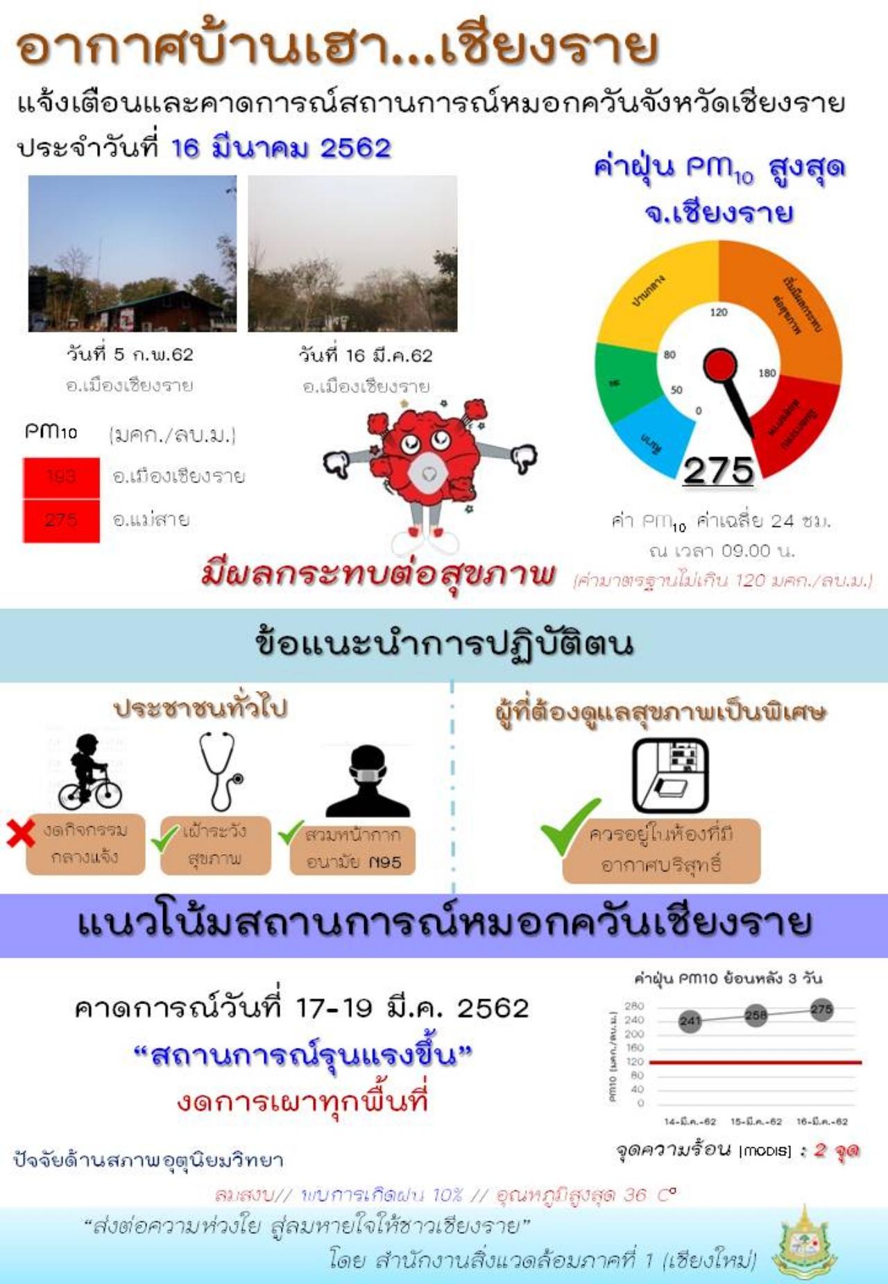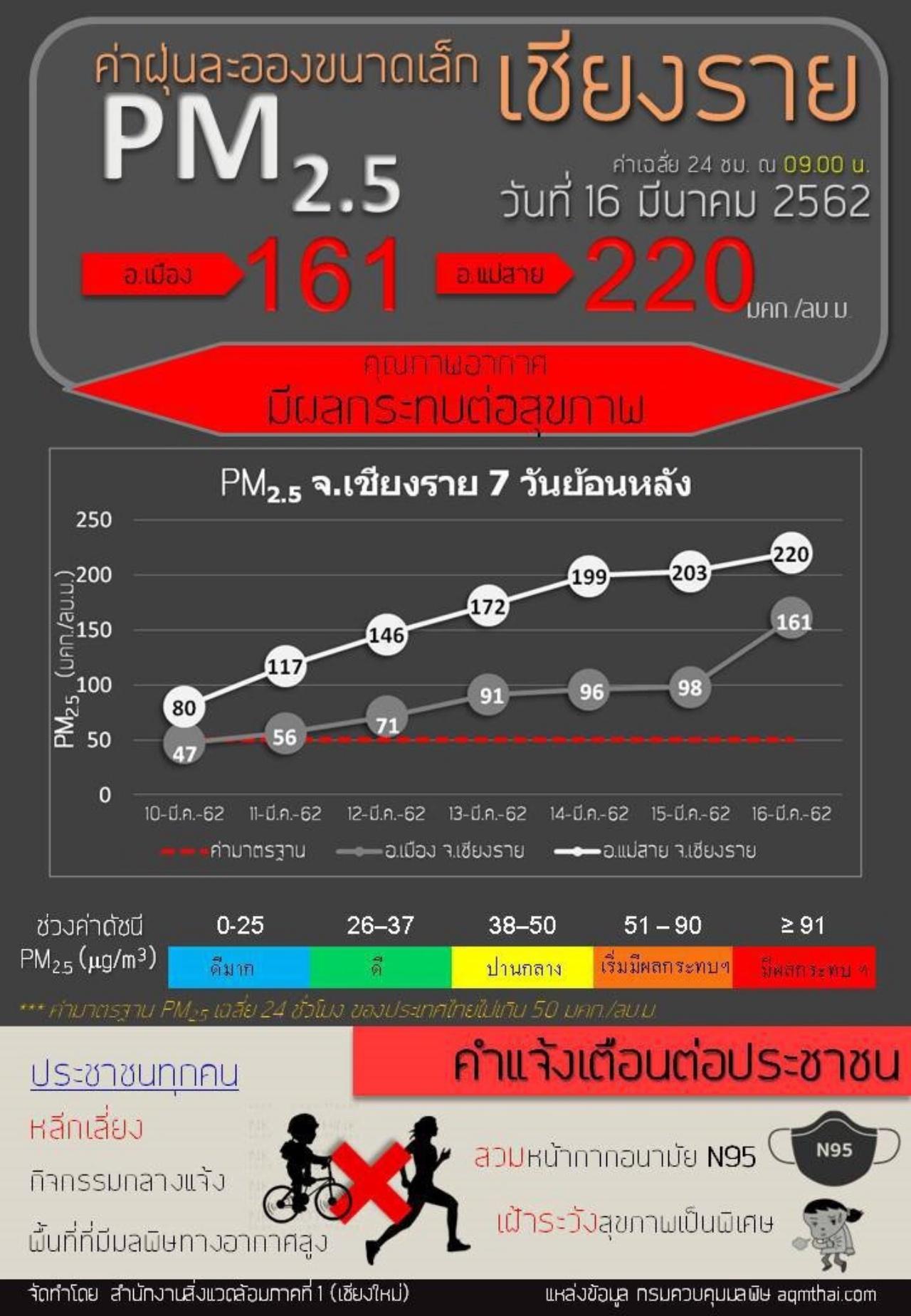 เมื่อวันที่ 16 มี.ค. 2562 สถานการณ์หมอกควัน จ.เชียงราย ยังอยู่ในขั้นวิกฤติติดต่อกันมาหลายวัน สถานีวัดอากาศสำนักงานสาธารณสุขแม่สาย วัดค่าฝุ่นละออง PM 10 สูงสุดที่ 275 มิลลิกรัม/ลูกบาศก์เมตร สูงกว่ามาตรฐานที่ไม่ควรเกิน 120 มลก./ลบ.ม. มีผลกระทบต่อสุขภาพ ค่าฝุ่นละอองขนาดเล็ก PM 2.5 วัดได้ 220 มลก./มล.ม. สูงเกินมาตรฐานที่ไม่เกิน 50 มลก./มล.ม.กว่า 4 เท่า มีผลกระทบต่อสุขภาพ