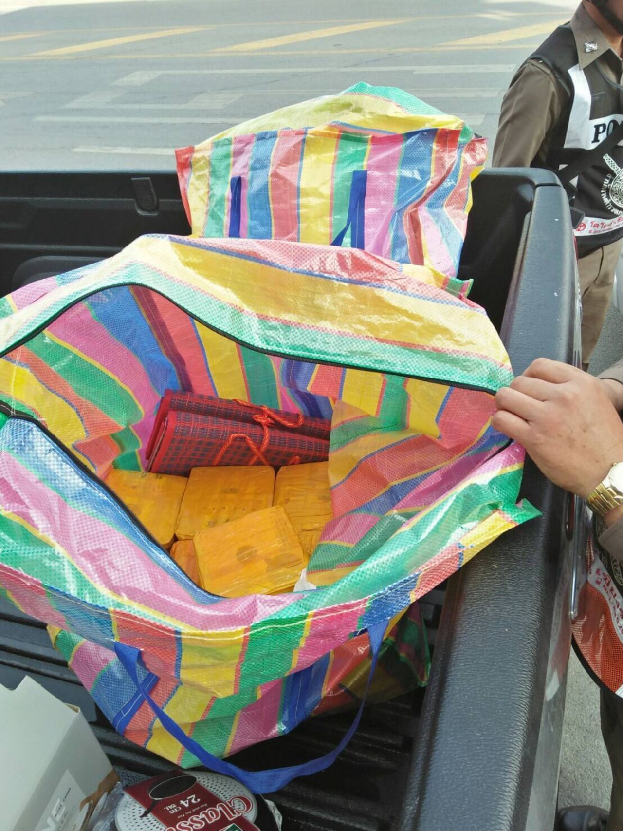 ผู้กำกับ สภ.เชียงของ กล่าวว่า เจ้าหน้าที่ตรวจยึดยาไอซ์ จำนวน 50 ก้อน 50 กก. ที่แพ็กอยู่ในถุงชาพันด้วยเทปกาวบรรจุอยู่ในกระสอบฟางขนาดใหญ่ พร้อมจับกุมผู้ต้องหา 2 คน นายเอ (นามสมมติ) อายุ 17 ปี และ นายบี (นามสมมติ) อายุ 16 ปี ไม่มีบัตรประชาชน ชาวบ้าน หมู่ 9 บ้านห้วยหาญ ต.ปอ อ.เวียงแก่น จ.เชียงราย จากการสอบสวนเบื้องต้นทราบว่า ผู้ต้องหาทั้งสองคน ได้รับค่าตอบแทนในการว่าจ้างขนยาเสพติด 300,000 บาท ให้นำยาไอซ์ลอตนี้ไปส่งยัง จ.อยุธยา โดยทั้งสองคนไปรับเงินว่าจ้างงวดแรกจำนวน 42,000 บาท จากหญิงไม่ทราบชื่อ แต่เรียกว่า เจ๊ ที่ บ้านแจ๋มป๋อง ม.5 ต.หล่ายงาว อ.เวียงแก่น