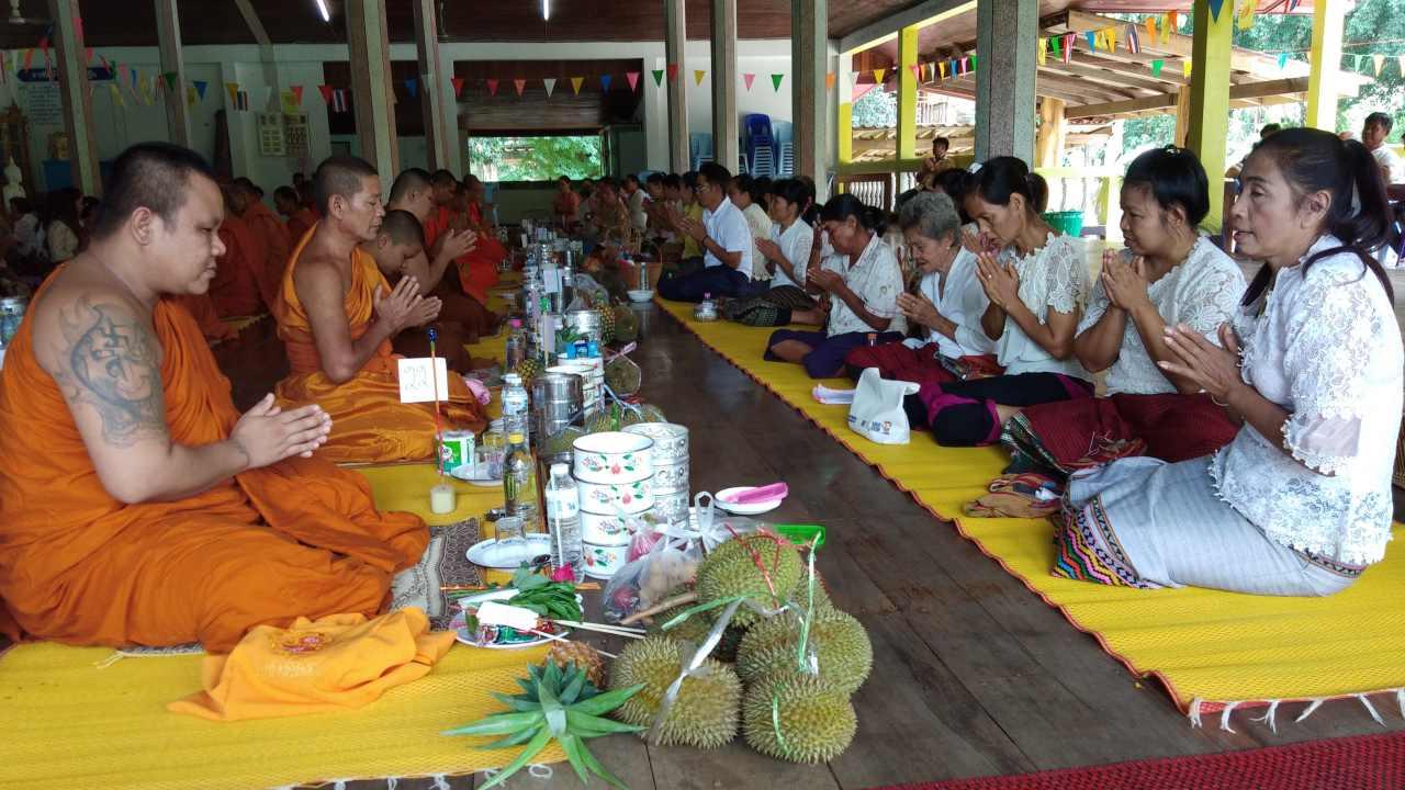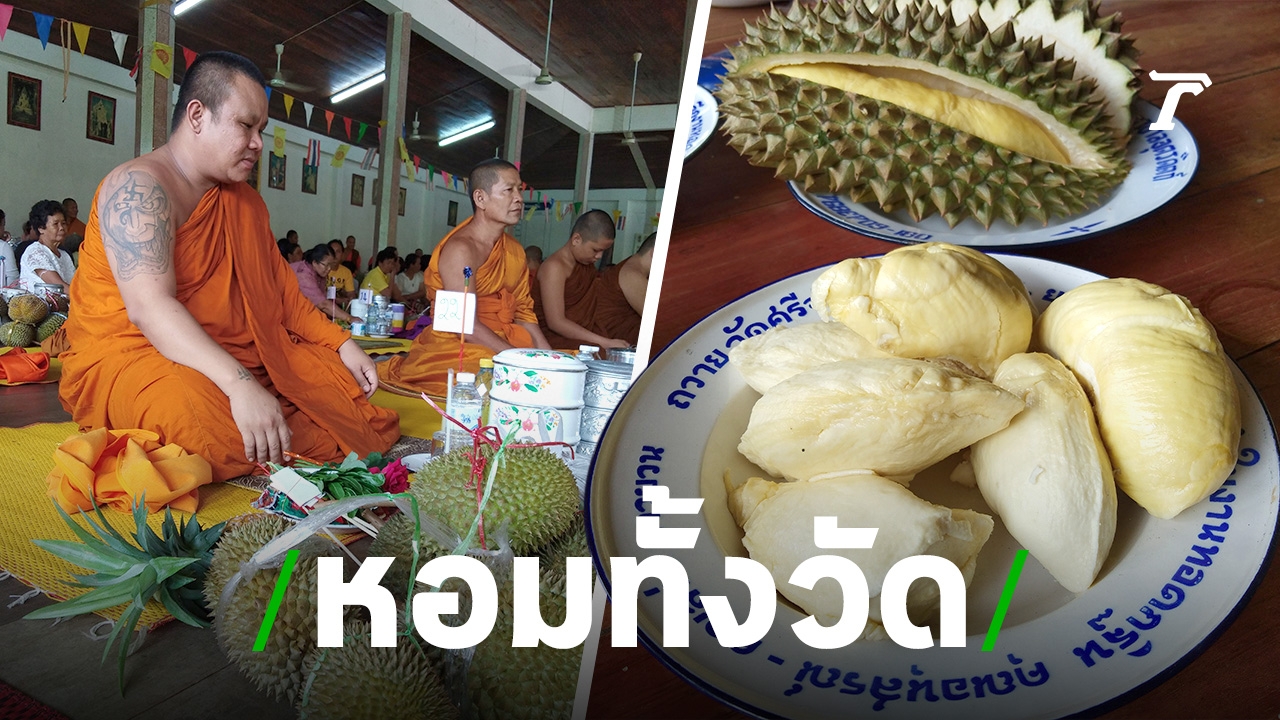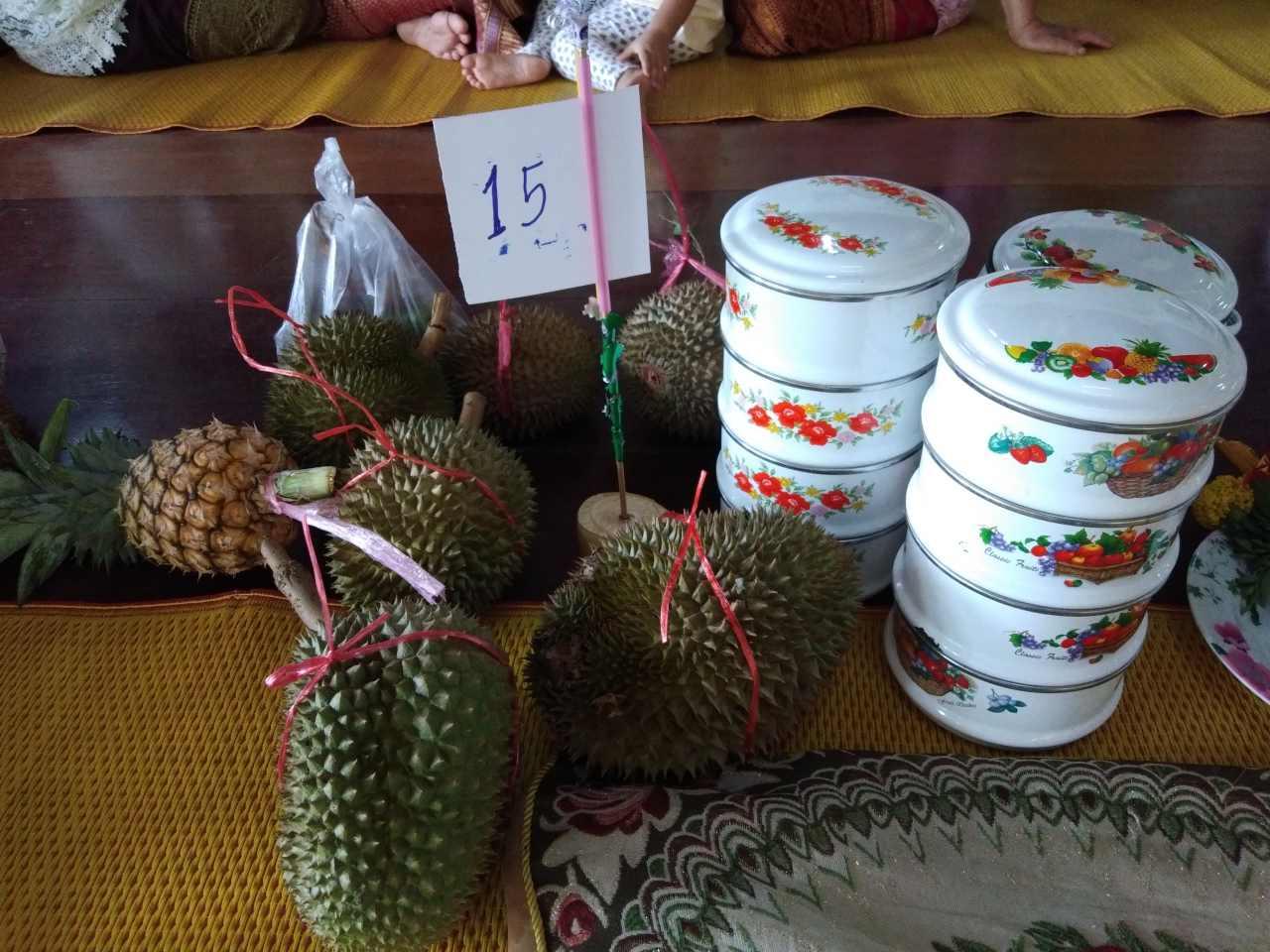 หลังจากถวายพระสงฆ์แล้ว ทุเรียนที่เหลือ ชาวบ้านก็จะช่วยกันปอกแล้วแจกจ่ายผู้มาร่วมงานได้รับประทานกันอย่างเอร็ดอร่อย กลิ่นทุเรียนโชยตลบอบอวล หอมกรุ่นไปทั่วบริเวณวัด.