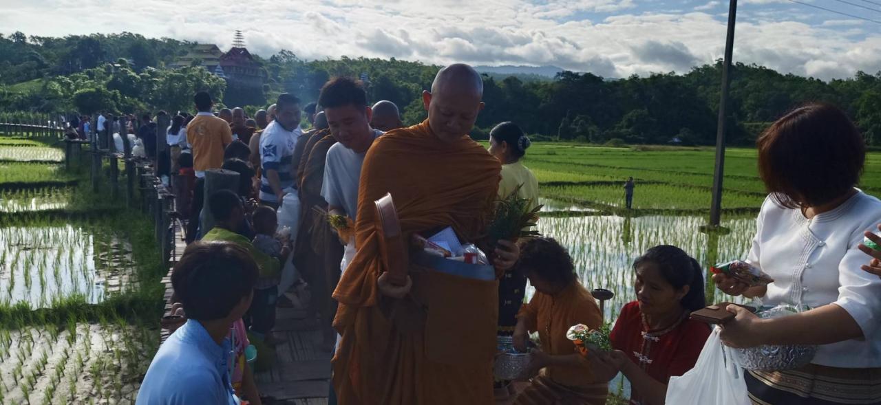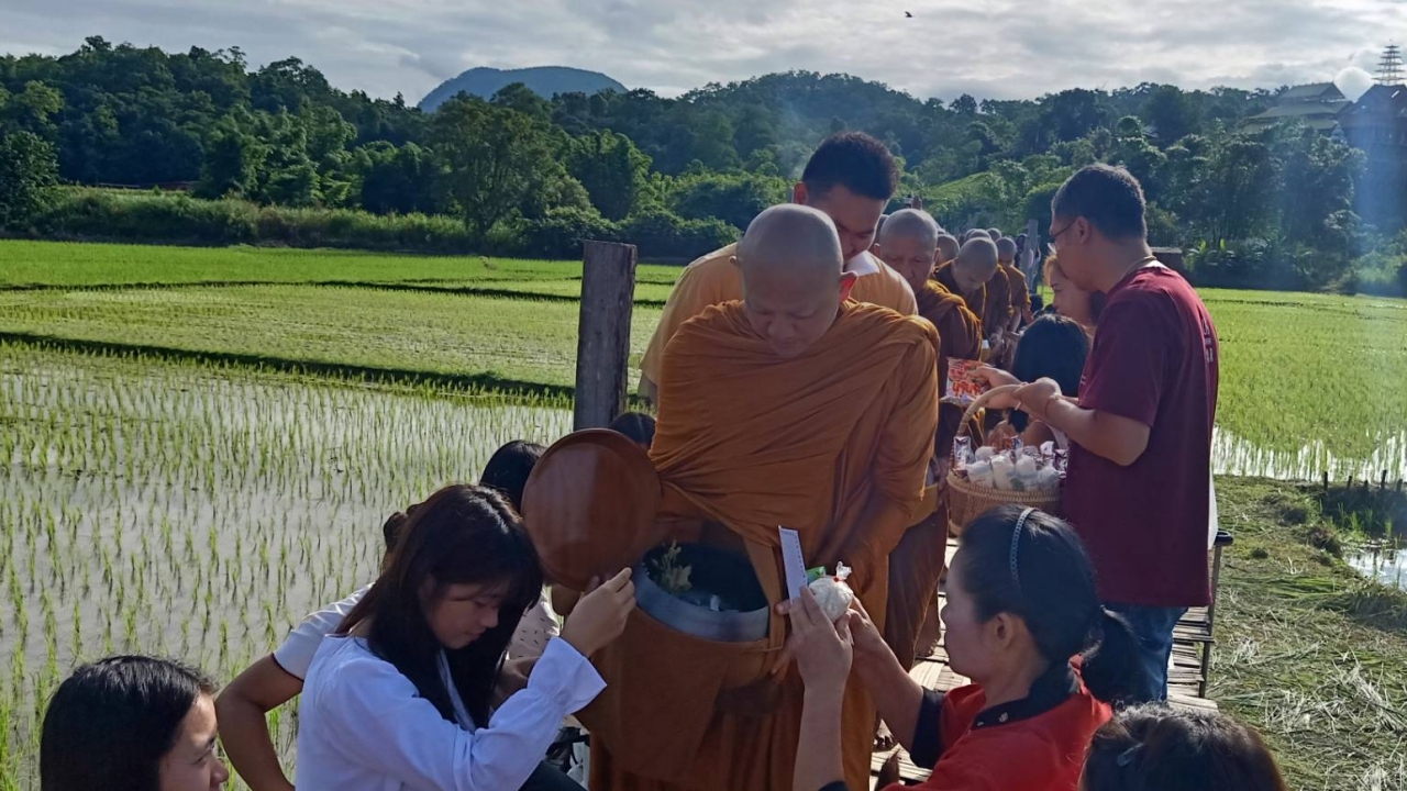 มีพุทธศาสนิกชนชาว ต.ปางหมู และชาว อ.เมืองแม่ฮ่องสอนจำนวนมากแต่งกายทั้งชุดพื้นเมืองชาวไต และชุดโทนสีเหลือง นำสิ่งของซึ่งส่วนใหญ่เป็นจำพวกอาหารสำเร็จรูป ร่วมตักบาตรพระภิกษุสงฆ์ – สามเณรจำนวน 29 รูป ที่รับบิณฑบาตไปตามสะพานไม้ไผ่ตลอดแนวความยาวที่ทอดข้ามทุ่งนาจากวัดภูสมะไปยังบ้านกุงไม้สัก ความยาวประมาณ 500 เมตร ท่ามกลางอากาศที่เย็นสบาย ปราศจากสายฝน ทั้งที่ก่อนหน้านี้ฝนตกติดต่อกันมากว่าสัปดาห์.