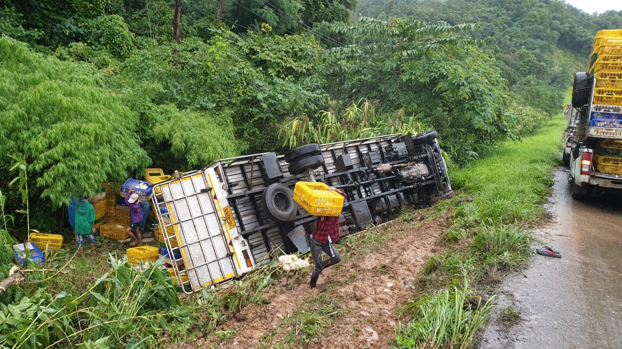เมื่อเวลา 08.00 น. วันที่ 26 ก.ค. เจ้าหน้าที่ตำรวจ สภ.แม่สอด ตรวจสอบเหตุรถบรรทุก 6 ล้อ ยี่ห้ออีซูซุ สีขาว ทะเบียน 70-9253 เชียงราย พลิกคว่ำตกข้างทางบริเวณถนนสายตาก-แม่สอด หลัก กม. 18 ใกล้เนินพิศวง ต.แม่ปะ อ.แม่สอด