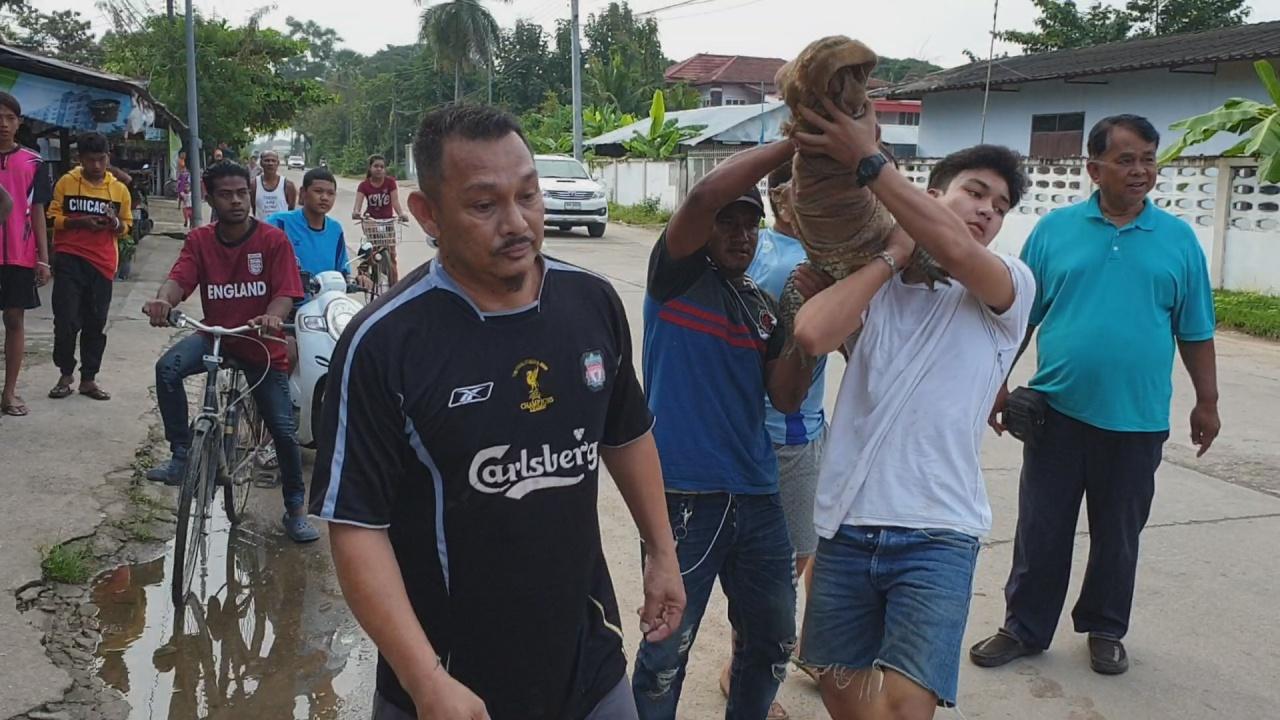 จากนั้นจึงนำตัวออกมา พบว่าจระเข้ลำตัวยาวกว่า 2 เมตรน้ำหนักร่วม 100 กิโลกรัม เบื้องต้นคนที่ไปจับและแบกน่าจะเป็นเจ้าของจระเข้ที่เลี้ยงไว้ โดยพบว่าแบกเข้าไปหลังตึกสองชั้นซอยใกล้โรงเรียนราษฎร์วิทยา จากการสอบถามชาวบ้านบอกว่า น่าจะเป็นจระเข้ที่มีคนเลี้ยงไว้ และหลุดมาช่วงกลางดึกโดยคลานหนีไปไกลเกือบ 1 กิโลเมตร ขณะที่เด็กนักเรียนบริเวณดังกล่าวต่างบอกว่าตกใจมาก ไม่เคยเจอะเจอมาก่อน