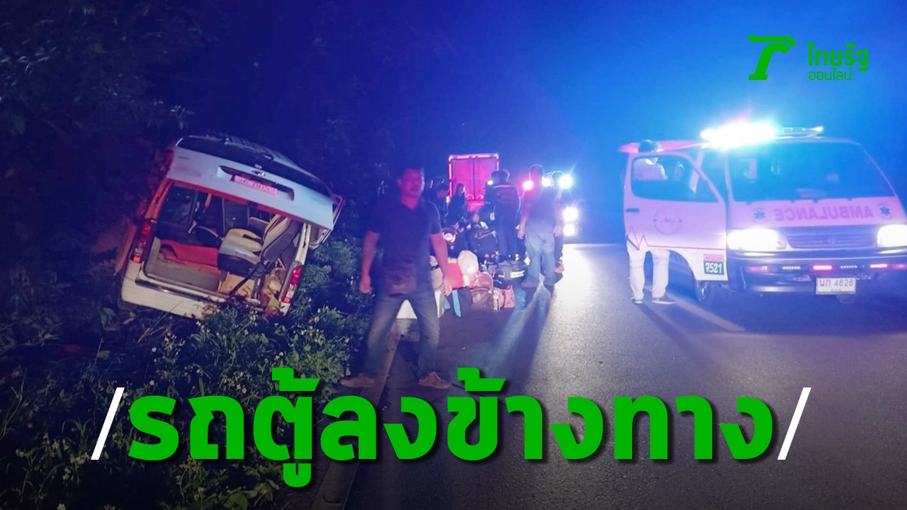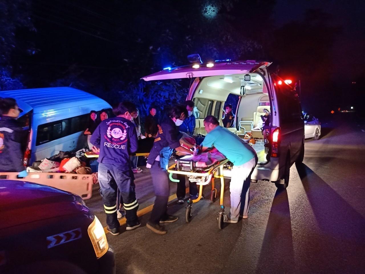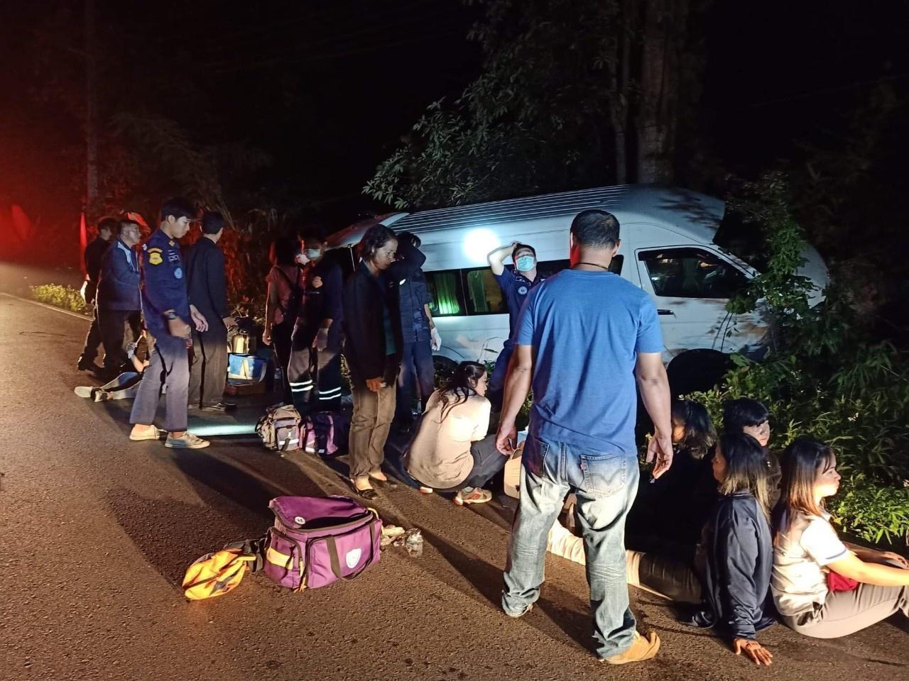 รถตู้โดยสารนำคณะครูจังหวัดน่าน-แพร่ ไปดูงานที่ จ.เชียงใหม่ รถเกิดเสียหลักลงข้างทางถนนสายลำปาง-เด่นชัย อ.แม่ทะ จ.ลำปาง ได้รับบาดเจ็บ 11 ราย ตร.คาดคนขับอาจจะหลับใน