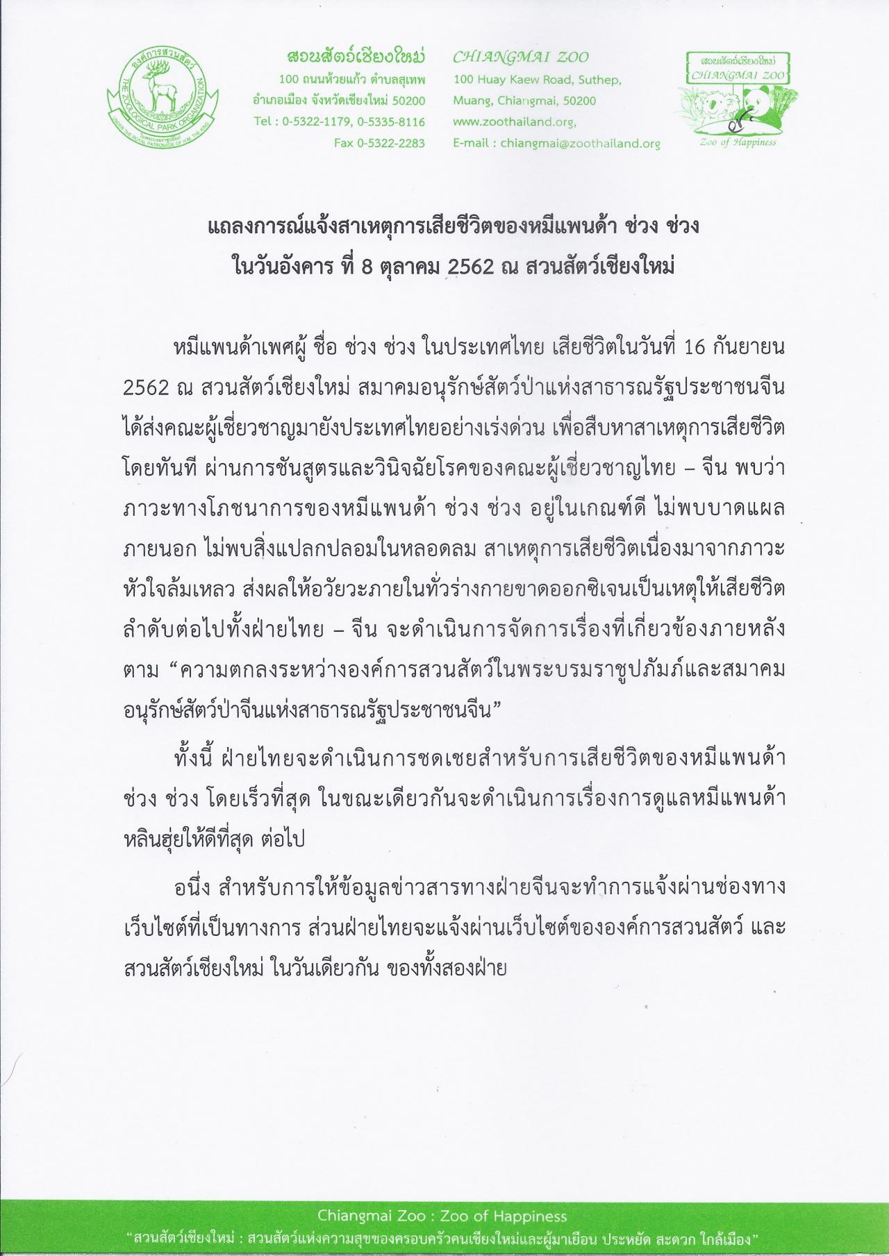 และเมื่อเวลา 16.30 น. วันที่ 8 ต.ค.62 ทางสวนสัตว์เชียงใหม่ ได้นำผลการชันสูตรและวินิจฉัยโรคของคณะผู้เชี่ยวชาญไทย-จีน ที่ทางฝ่ายจีนส่งผ่านมายังฝ่ายไทย และองค์การสวนสัตว์ในพระบรมราชูปภัมภ์ พบว่าภาวะทางโภชนาการของหมีแพนด้าช่วงช่วง อยู่ในเกณฑ์ดี ไม่พบบาดแผลภายนอก ไม่พบสิ่งแปลกปลอมในหลอดลม สาเหตุการเสียชีวิตเนื่องมาจากภาวะหัวใจล้มเหลว ส่งผลให้อวัยวะภายในทั่วร่างกายขาดออกซิเจน เป็นเหตุให้เสียชีวิต ลำดับต่อไปทั้งฝ่ายไทย-จีนจะดำเนินการจัดการเรื่องที่เกี่ยวข้องภายหลัง ตาม "ความตกลงระหว่างองค์การสวนสัตว์ในพระบรมราชูปภัมภ์ และสมาคมอนุรักษ์สัตว์ป่จีนแห่งสาธารณรัฐประชาชนจีน"