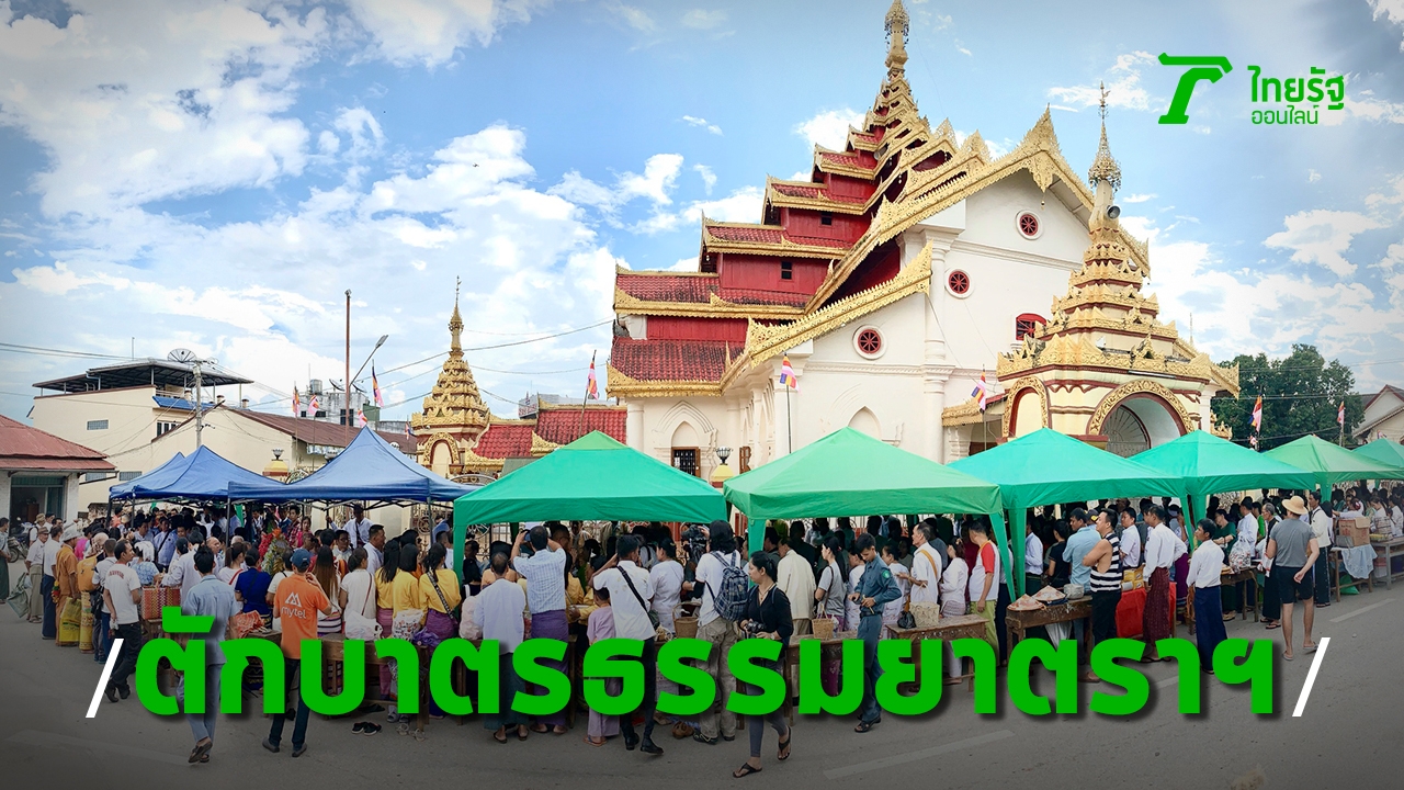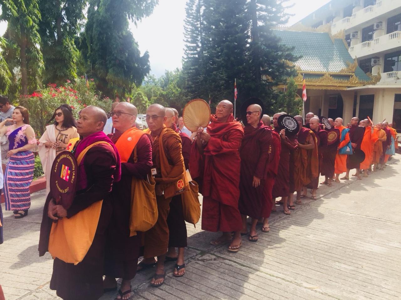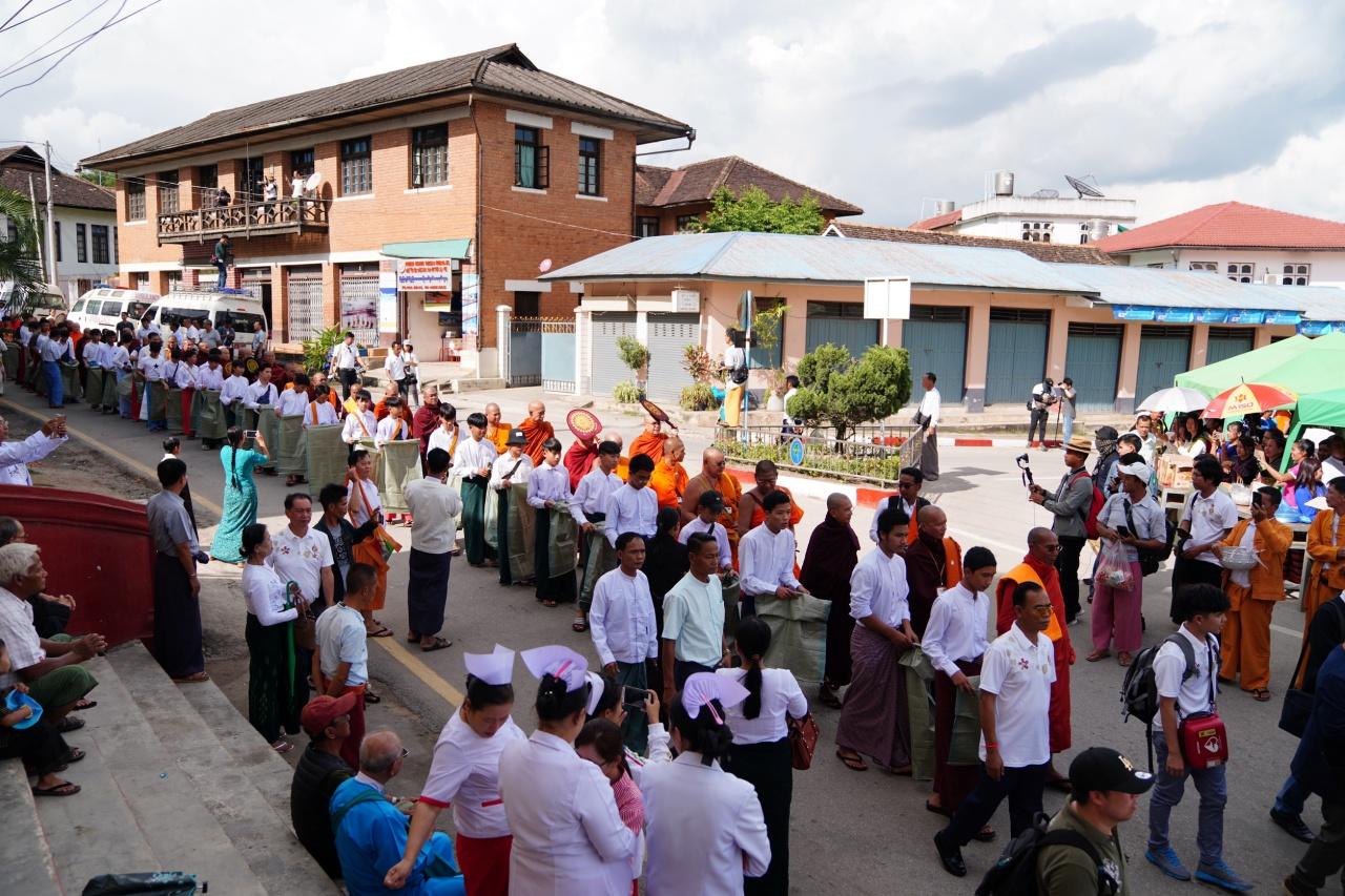 ชาวพุทธของเมืองเชียงตุง รัฐฉาน เมียนมา แห่ร่วมตักบาตรพระสงฆ์จากคณะธรรมยาตรา 5 แผ่นดินลุ่มน้ำโขง ที่บริเวณรอบวัดพระธาตุมหาเมี๊ยะมุนี กันเนืองแน่นหลายพันคน