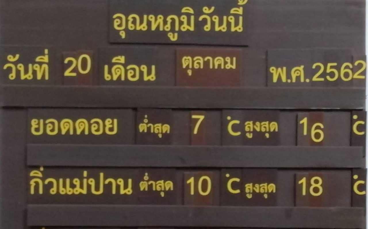 ที่ดอยอินทนนท์ อ.จอมทอง จ.เชียงใหม่ เช้าวันที่ 20 ต.ค. บริเวณยอดดอยจุดสูงสุดของประเทศ อุณหภูมิต่ำสุดอยู่ที่ 7 องศาเซลเซียส ส่วนกิ่วแม่ปาน อุณหภูมิต่ำสุดที่ 10 องศาเซลเซียส มีนักท่องเที่ยวเดินทางขึ้นมาสัมผัสอากาศหนาวจำนวนมาก โดยในวันที่ 19 ต.ค.62 มียอดผู้ขึ้นมาเที่ยวชม ทั้งชาวไทยและต่างประเทศ จำนวน 4,007 คน