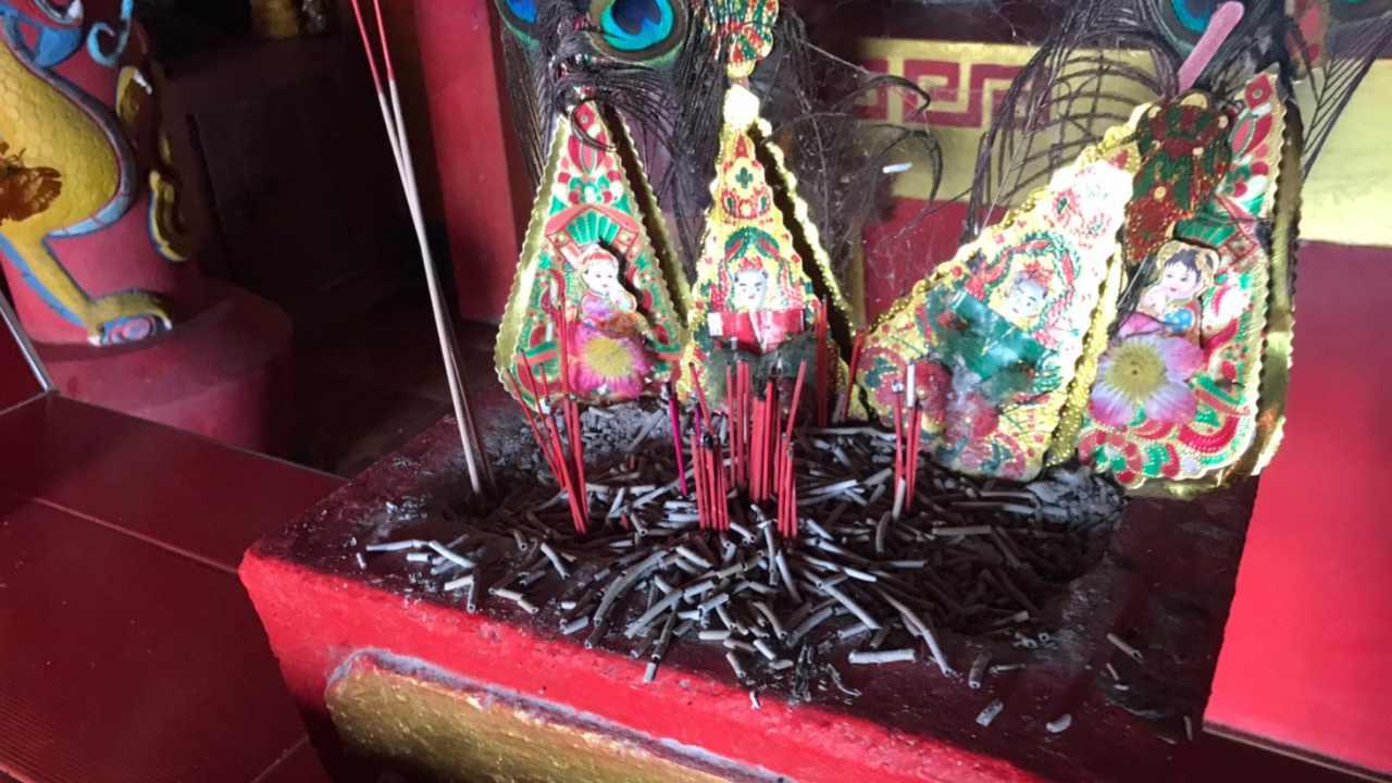 นอกจากนี้ ยังมีการนำธูปปักลงบนกระถางโดยใช้ด้านหัวทิ่มลง และใช้บุหรี่ที่จุดสูบแล้ว ปักลงในปลายก้านธูป ส่วนกระถางสำหรับจุดธูปไหว้เจ้าพ่อ ซึ่งเป็นกระถางหลักใช้ในพิธีสำคัญ ถูกเคลื่อนย้ายและมีเถ้าผงจากธูปกระจัดกระจายเต็มไปหมด