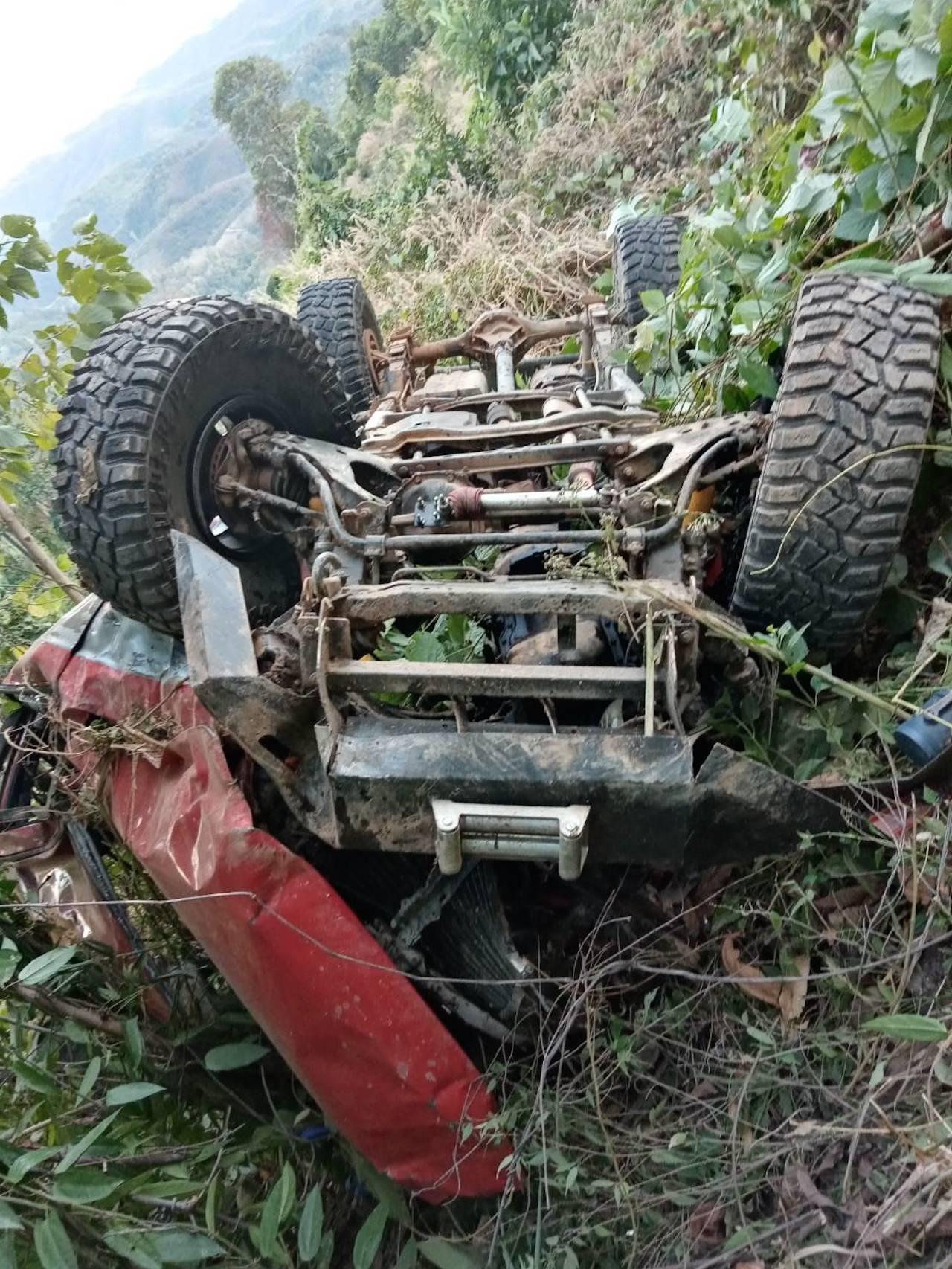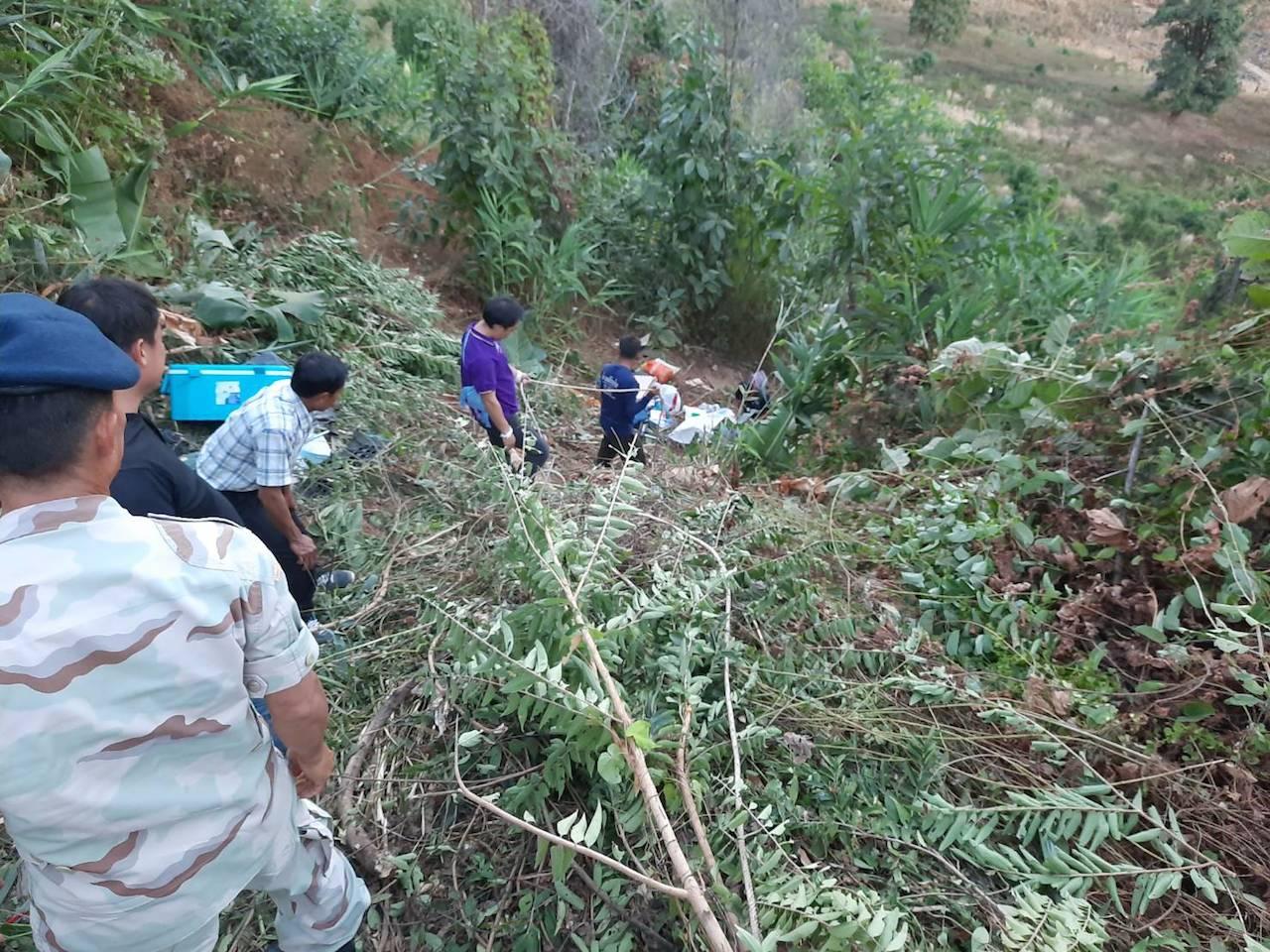 จากการตรวจสอบในที่เกิดเหตุเบื้องต้น พบว่าเป็นรถยนต์กระบะออฟโรด มิตซูบิชิ รุ่น สตราดา (strada) สีแดงเทา ตกลงในหุบเหว สภาพรถพังยับทั้งคัน และมีชิ้นส่วนของรถตกกระจายเป็นระยะ เส้นทางดังกล่าวเป็นถนนสายรองไม่มีป้ายสัญญาน เป็นถนนที่คนท้องถิ่นใช้เส้นทาง มีความสูงชันและคดเคี้ยวมาก ผู้ขับมาด้วยความเร็วเพราะเป็นทางลงเขาและไม่ชำนาญเส้นทาง จึงเกิดอุบัติเหตุขึ้น
