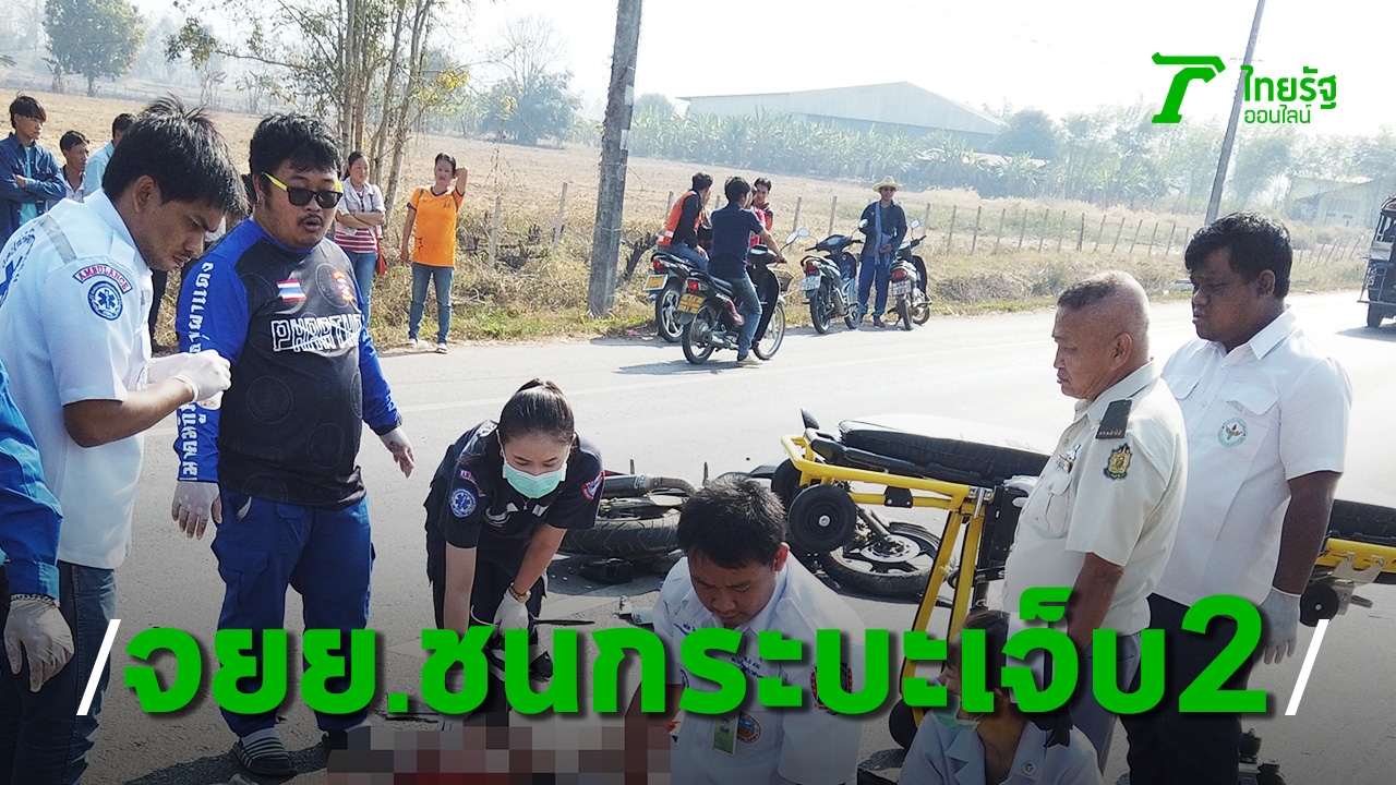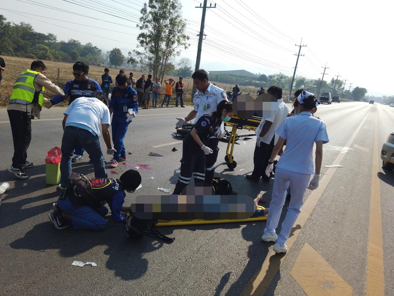 สาวเซเว่นซ้อน จยย.หนุ่มป่าไม้ขี่เข้าเมืองถูกกระบะออกจากปั๊มไม่ได้มองรถทางตรง ตัดหน้ากระชั้นชิดเบรกไม่ทันชนเต็มแรง ร่างกระเด็นสาหัสทั้งคู่ บนถนนสายแม่สอด-อุ้มผาง อ.แม่สอด จ.ตาก