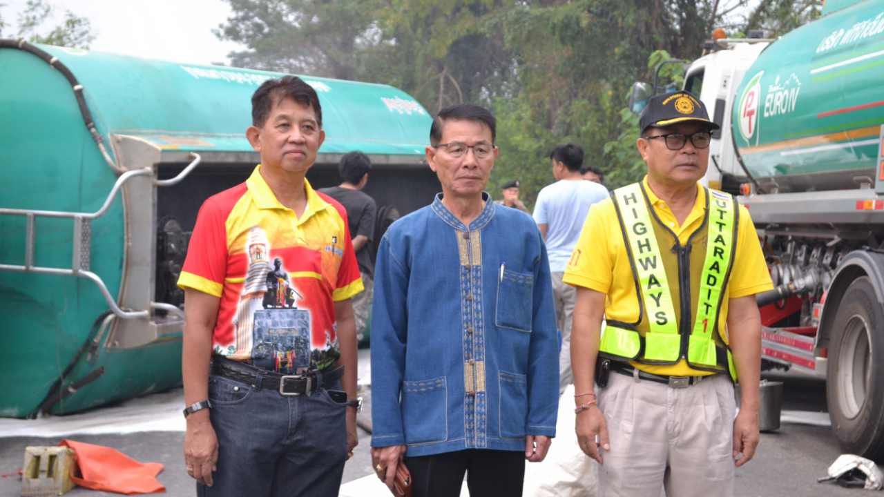 พ่อเมืองลับแล ลงพื้นที่บัญชาการเอง หลังเกิดเหตุ รถบรรทุกน้ำมัน แก๊สโซฮอล์ ดีเซล รวม 19,000 ลิตร เสียหลักพลิกคว่ำ ขวางถนนที่อ.พิชัย สาเหตุจากคนขับหลับใน ต้องเร่งเคลียร์เปิดการจราจร