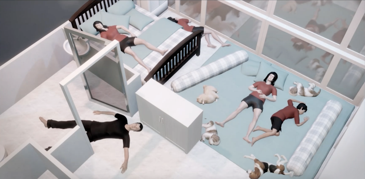- ศพคนทั้ง 5 และสุนัขอีก 6 นอนเรียงรายกระจายอยู่ทั่วทั้งพื้นที่ห้องนอน โดยมีไอเย็นจากเครื่องปรับอากาศปกคลุมอยู่ทั่วทั้งห้อง