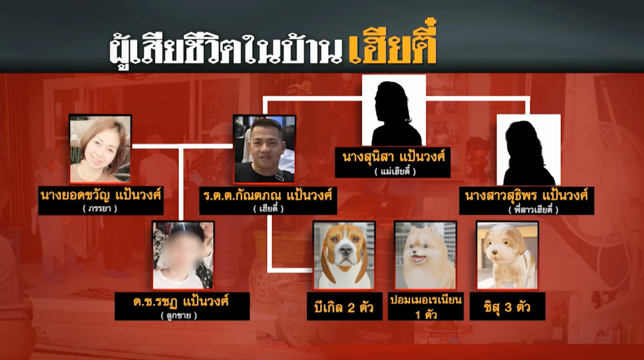 - จากการสันนิษฐานของเจ้าหน้าที่ตำรวจ ระบุว่า ในช่วงกลางดึกของคืนนั้น เฮียตี๋และภรรยา ได้ชวนแม่, พี่สาว และลูกชายวัย 13 ปี ของตัวเอง รวมทั้งหมด 5 คน ไปนั่งเล่นกันในห้องนอนของแม่ พร้อมกับได้นำสุนัข 6 ตัวที่เฮียตี๋รักมาก เข้ามาอยู่ภายในห้องด้วย