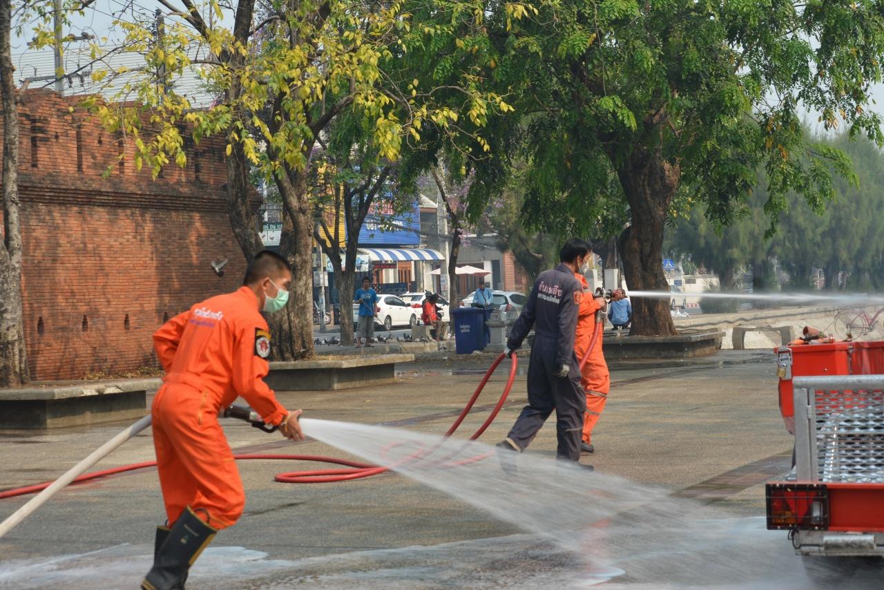 เมื่อวันที่ 20 มีนาคม 2563 บริเวณข่วงประตูท่าแพ อ.เมือง จังหวัดเชียงใหม่ นายเจริญฤทธิ์ สงวนสัตย์ ผู้ว่าราชการจังหวัดเชียงใหม่ พร้อมด้วย นายคมสัน สุวรรรณอัมพา รองผู้ว่าราชการจังหวัดเชียงใหม่ ปล่อยรถสเปรย์น้ำผสมยาฆ่าเชื้อโรค ล้างถนน บริเวณรอบคูเมือง แหล่งท่องเที่ยว รวมไปถึงถนนทุกสายในเขตเทศบาลนครเชียงใหม่ โดยร่วมกับศูนย์ป้องกันและบรรเทาสาธารณภัย เขต 10 ลำปาง, สำนักงานป้องกันและบรรเทาจังหวัดเชียงใหม่, มณฑลทหารบกที่ 33 และเทศบาลนครเชียงใหม่ เพื่อเป็นการป้องกันการแพร่ระบาดของโรคโควิด-19 รวมทั้งยังเป็นการสร้างความมั่นใจให้กับประชาชนและนักท่องเที่ยวในจังหวัดเชียงใหม่ โดยจะทำการฉีดพ่นอย่างต่อเนื่องไปจนกว่าสถานการณ์จะคลี่คลาย