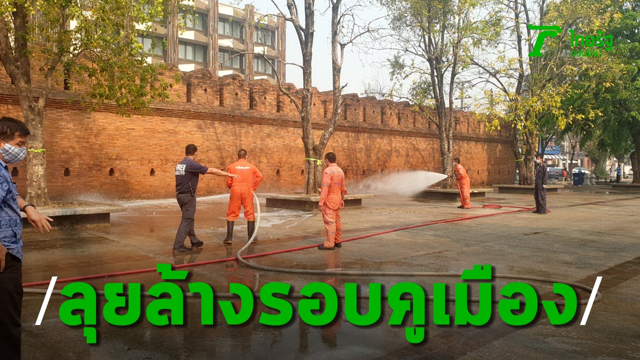 จังหวัดเชียงใหม่ ปล่อยแถวขบวนรถออกฉีดพ่นน้ำยาฆ่าเชื้อโรค พื้นที่รอบคูเมือง ป้องกันการแพร่ระบาดโรคโควิด-19 เพื่อสร้างความมั่นใจให้กับประชาชนและนักท่องเที่ยว จนกว่าสถานการณ์จะคลี่คลาย