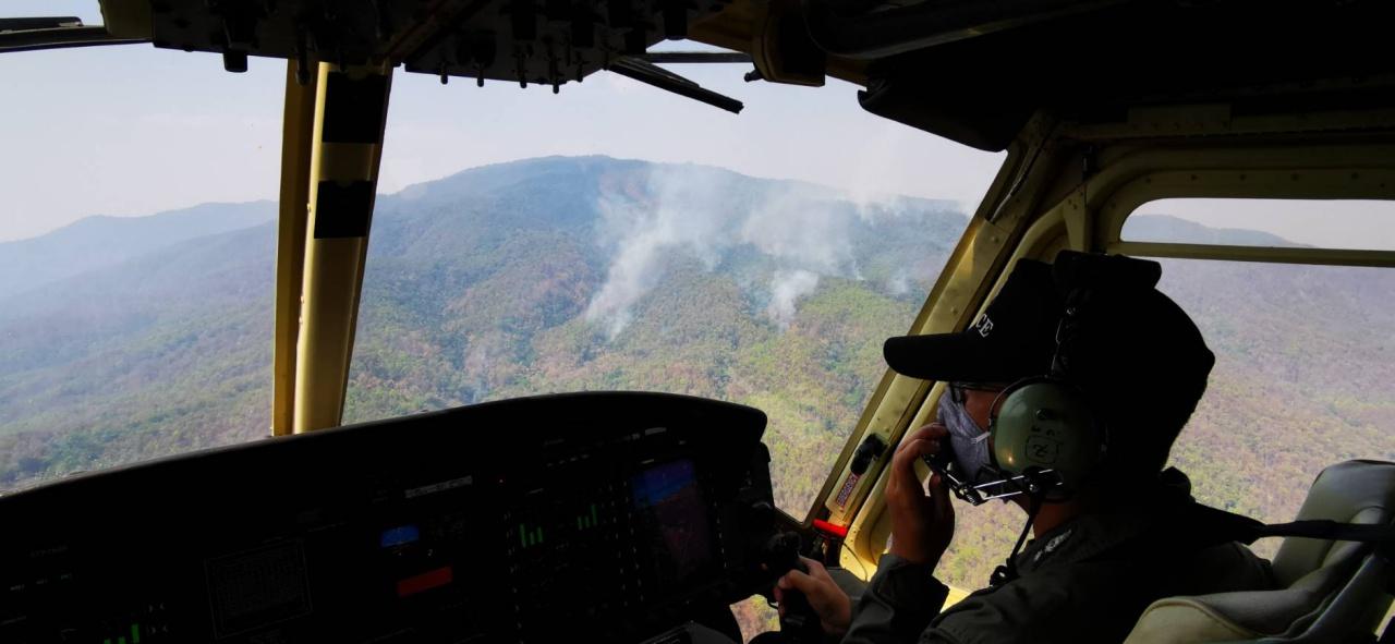 จากนั้น รองผู้ว่าราชการจังหวัดเชียงใหม่ ร่วมกับ พล.ต.ต.พิเชษฐ จีระนันตสิน ผบก.ภ.จว.เชียงใหม่ ขึ้นเฮลิคอปเตอร์ของสำนักงานตำรวจแห่งชาติ สำรวจแนวไฟป่าที่ลุกไหม้ในพื้นที่อุทยานแห่งชาติดอยสุเทพ-ปุย เพื่อรวบรวมข้อมูลและหารือถึงแนวทางแก้ไข โดยศูนย์บัญชาการฯจังหวัดเชียงใหม่ ได้ขอสนับสนุน ฮ.Mi-17V5 เข้าปฏิบัติภารกิจดับไฟบริเวณใกล้เนินพลับพลาทรงงานแทน โดยมีหน่วยป่าไม้ภาคพื้นดิน และรถบรรทุกน้ำดับเพลิงของเทศบาลตำบลช้างเผือกเข้าร่วมปฏิบัติงาน พร้อมจัดชุดเหยี่ยวไฟผลัดกลางคืน 60 นาย สับเปลี่ยนกำลัง เข้าปฏิบัติการดับเพลิงในช่วงกลางคืนและเฝ้าระวังอย่างต่อเนื่อง.