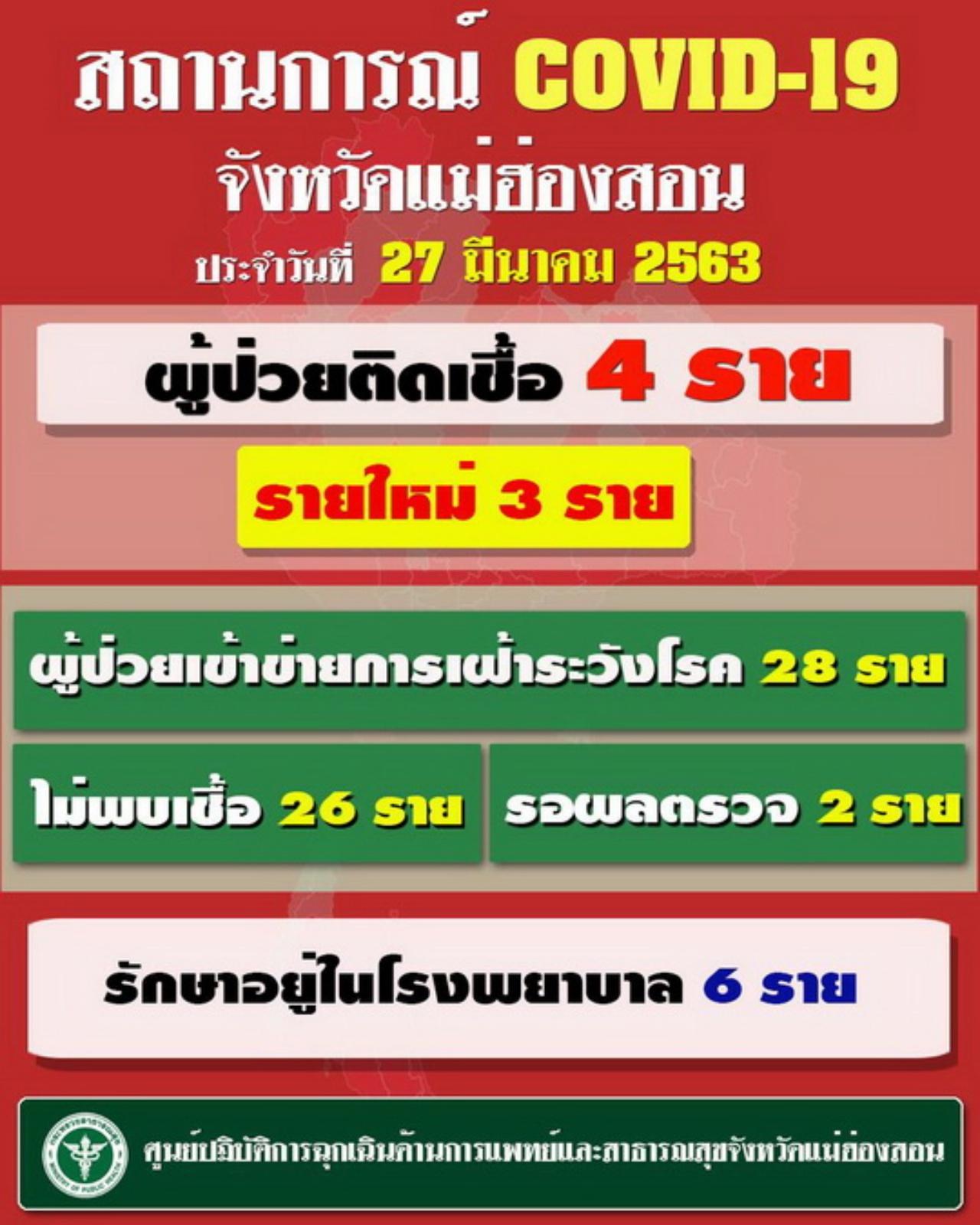 ผู้ว่าราชการจังหวัดแม่ฮ่องสอน กล่าวว่า วันนี้ ได้รับรายงานผลการตรวจทางห้องปฏิบัติการพบว่า มีผู้ติดเชื้อไวรัสโคโรน่า 2019 เพิ่มอีกจำนวน 3 ราย เป็นเพศหญิงอายุ 23ปี และ เพศชายอายุ 1 ปี ซึ่งเป็นภรรยากับบุตรของผู้ป่วยรายแรก มีประวัติเดินทางจากกรุงเทพมหานครกลับภูมิลำเนาโดยรถยนต์ส่วนตัวกับผู้ป่วยรายแรกและอีกรายเป็นเพศชายอายุ 37 ปีมีประวัติเดินทางกลับจากประเทศปากีสถานในห้วงเวลาเดียวกับผู้ป่วยรายแรก รวมพบผู้ป่วยด้วยโรคโควิด-19 จ.แม่ฮ่องสอน จำนวน 4 คน