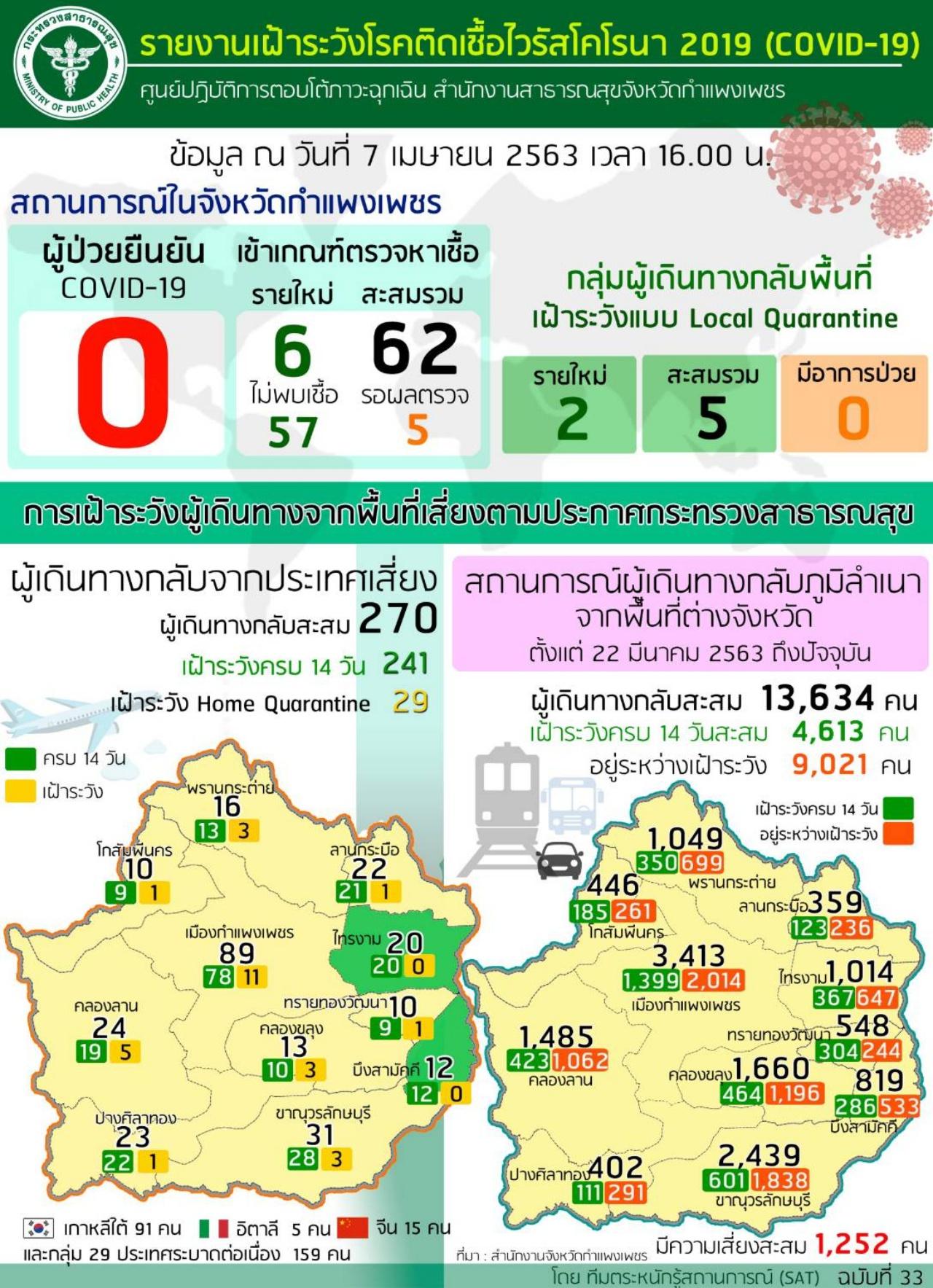 โดยมีข้อมูลเมื่อ 7 เม.ย.63 เวลา 16.00 น. จ.กำแพงเพชร มีผู้เข้าเกณฑ์การตรวจหาเขื้อ 62 ราย ไม่พบเขื้อ 57 ราย รอผลตรวจอีก 5 ราย.