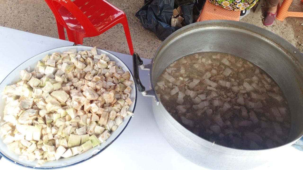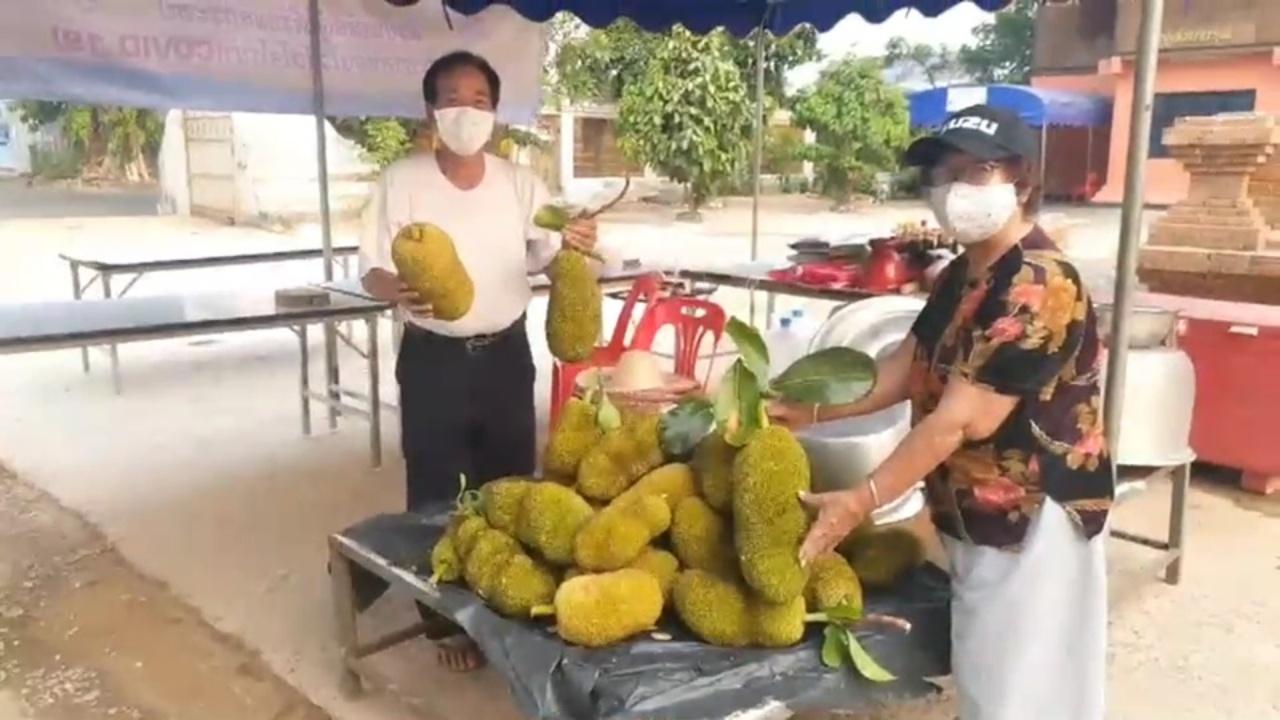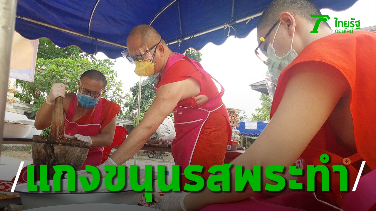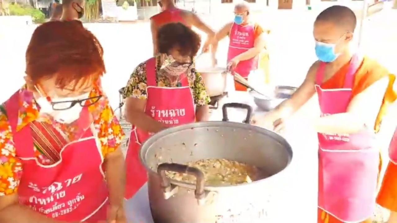 พระสงฆ์-สามเณร และชาวบ้านช่วยชา ประกอบอาหารทำแกงขนุนเพื่อแจกจ่ายให้ชาวบ้านในช่วงวิกฤติโควิด-19 ระบาด โดยชาวบ้านต่างเดินออกจากบ้านมารับแกงขนุน ที่พระสงฆ์และสามเณร และชาวบ้านได้ช่วยกันทำ หลังจากนั้นก็ได้ตักใส่ถุง จัดแกงเป็นถุง มอบให้กับชาวบ้านมารับไปรับประทาน