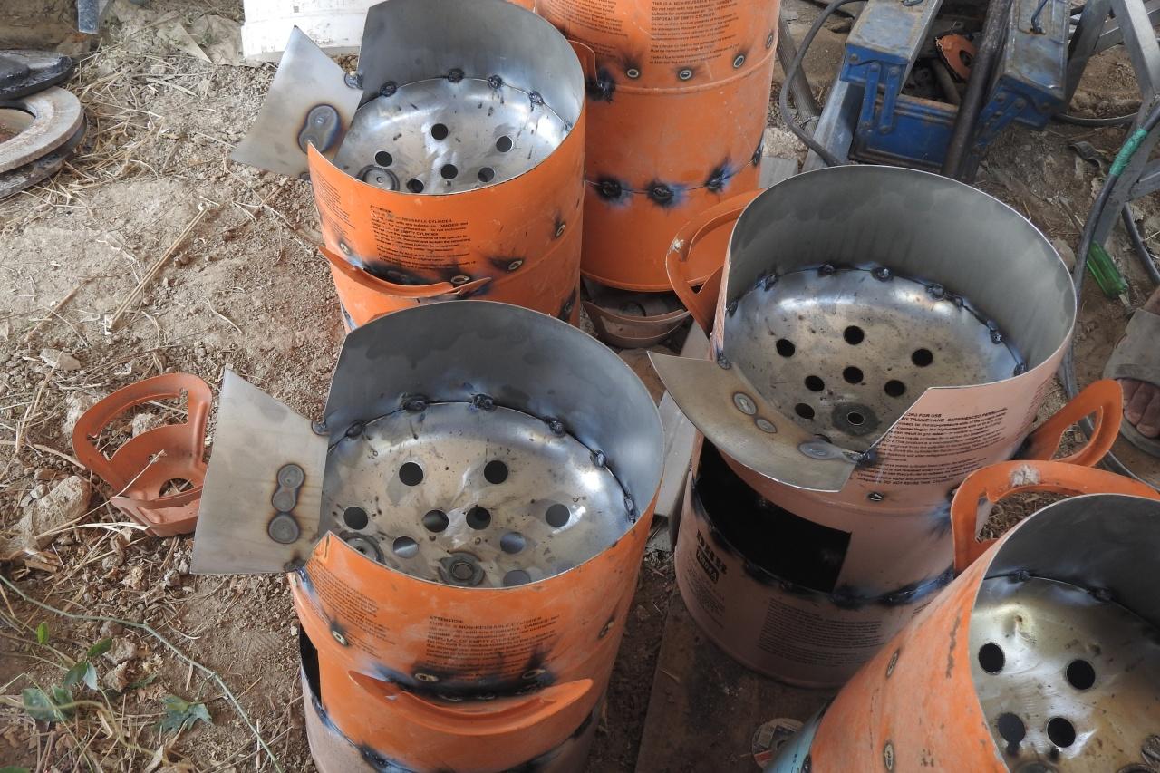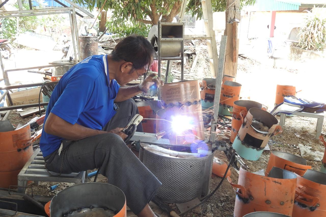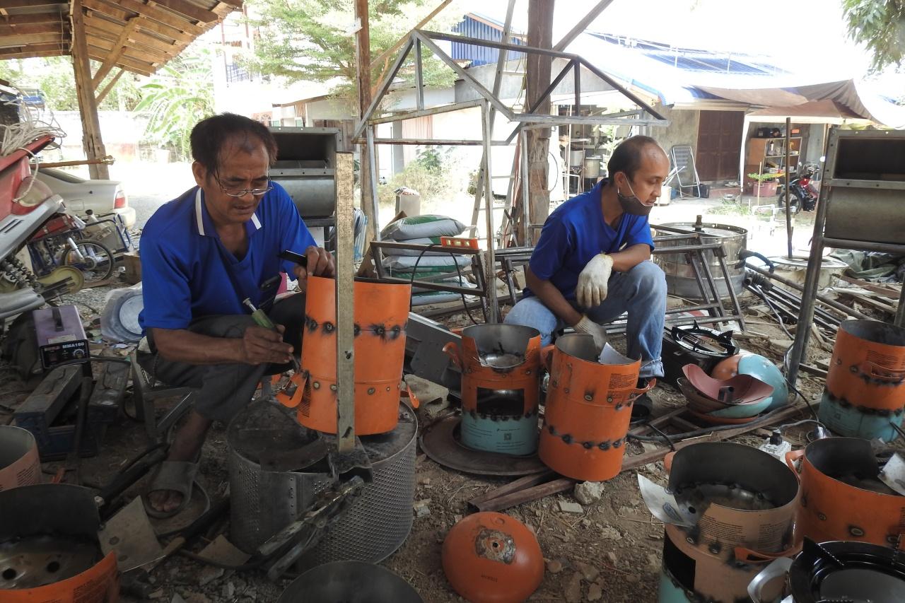 เจ้าของร้านผ้าม่านฯ กล่าวต่อว่า หลังจากนั้น จึงชักชวนกันมาลองทำเตาอั้งโล่จากถังน้ำยาแอร์เก่าดู จนทุกคนลงความเห็นว่าน่าจะทำได้ จะลงมือทำจึงได้ศึกษาค้นคว้า ตั้งแต่เริ่มจากวาดแบบขึ้นมา และศึกษาในอินเทอร์เน็ต และได้รูปแบบตามความต้องการของตน จากนั้นได้ไปหาซื้อถังน้ำยาแอร์เก่าจากร้านทำแอร์ จากนั้นจะนำถังน้ำยาแอร์มาผ่า โดยถังน้ำยาแอร์เก่า 3 ถัง จะทำเตาอั้งโล่ ได้ 2 ใบ โดยจะใช้ชิ้นส่วนทุกชิ้นที่ตัดออกนำมาเชื่อมใหม่ ให้เป็นเตาอั้งโล่ตามแบบ จากนั้นจะนำไปเจียรเพื่อลบคมของแผ่นเหล็กให้สวยงาม ก่อนที่จะนำไปพ่นสี และนำหัวมาใส่สำหรับตั้งหม้อหรือกระทะ