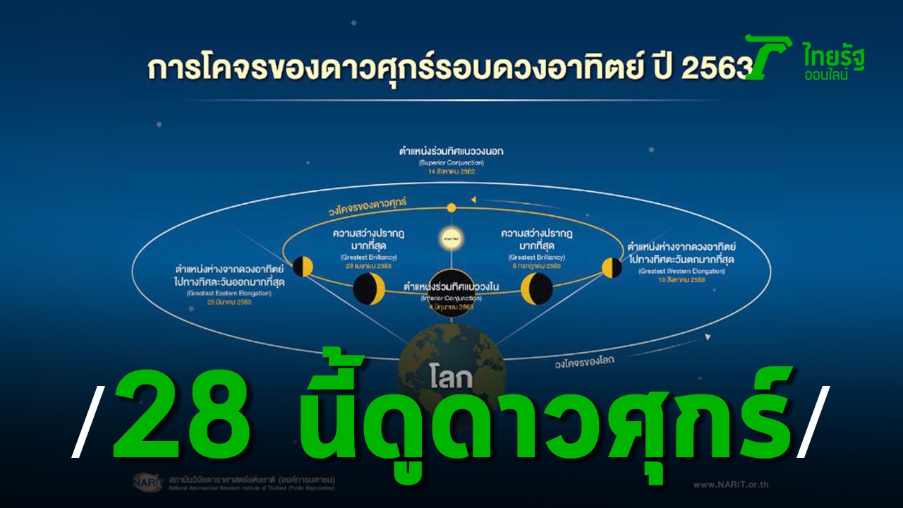 สดร. ชวนคนไทยจับตา "ดาวศุกร์" สว่างที่สุดในรอบปีในวันที่ 28 เม.ย. และ 8 ก.ค.63 สามารถดูได้ด้วยตาเปล่าชัดเจนทั่วประเทศ เนื่องจากเป็นช่วงที่มีขนาดเสี้ยวค่อนข้างใหญ่ และโคจรห่างจากโลกในระยะทางที่เหมาะสม