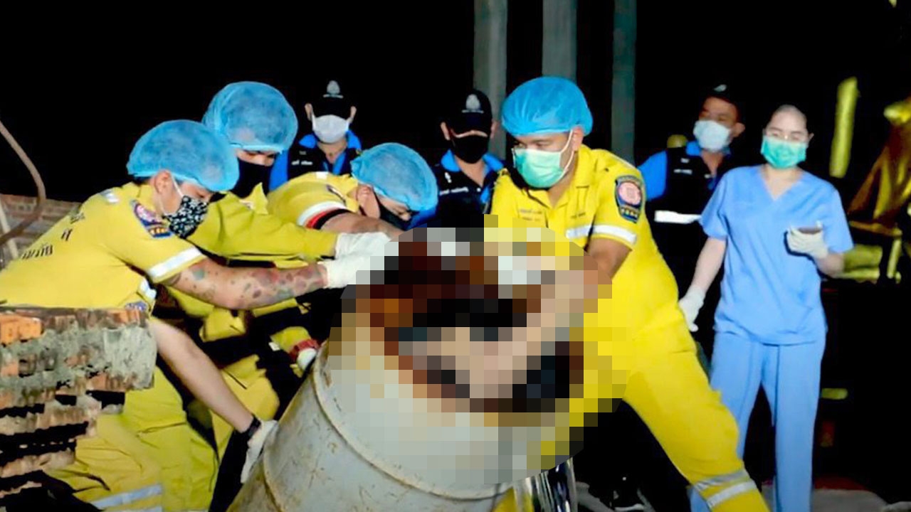 กู้ภัยนำศพนายดุสิต ลาภพาณิชยกุล ส.ท.เมืองตาคลี จ.นครสวรรค์ ออกมาจากถังน้ำ 200 ลิตร หน้าวิหารหลวงพ่อขวัญบนยอดเขาน้อย เขตเทศบาลเมืองตาคลี คาดเป็นอุบัติเหตุหัวทิ่มจมน้ำตายในถังหรือถูกฆาตกรรม.