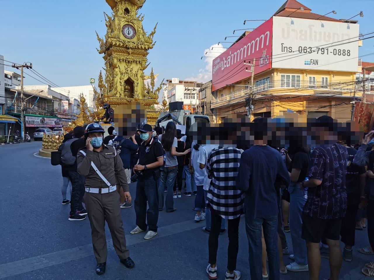 โดยมีเจ้าหน้าที่ตำรวจ สภ.เมือง และชุดสืบสวน บก.ภ.เชียงราย นำโดย พ.ต.อ.มานพ เสนากูล รอง ผบก.เชียงราย มาอำนวยความสงบ และกล่าวว่า ได้พูดกับแกนนำ อย่าได้พูดก้าวล่วงสถาบัน ซึ่งเป็นที่เข้าใจ คาดว่าจะใช้เวลาประมาณ 20.00 น. ก็จะสลายตัวตามที่ประกาศไว้.