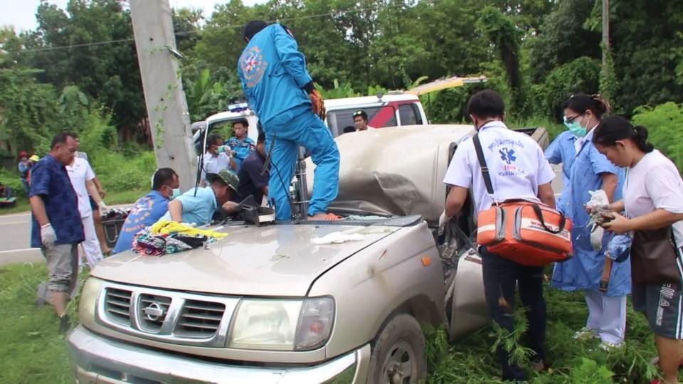 ในที่เกิดเหตุพบรถกระบะนิสสัน สีบรอนซ์ทอง ทะเบียน บธ 9259 แพร่ ชนอัดกับเสาไฟฟ้า สภาพหลังคาเปิด มีคนติดในรถสองคน หน่วยกู้ภัยเร่งใช้เครื่องตัดถ่างเอาคนเจ็บออกมาได้ แต่ปรากฏว่าทั้งคู่เสียชีวิตแล้ว