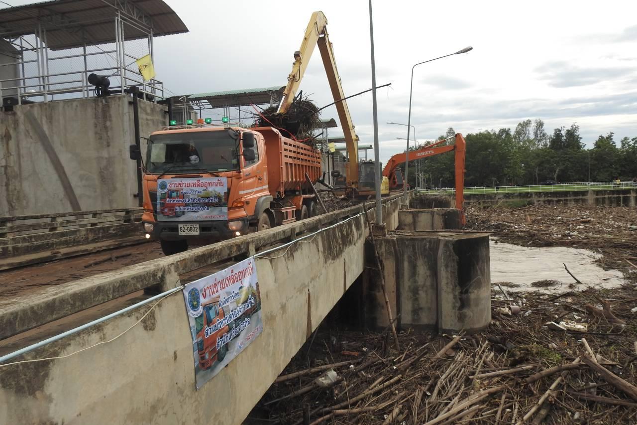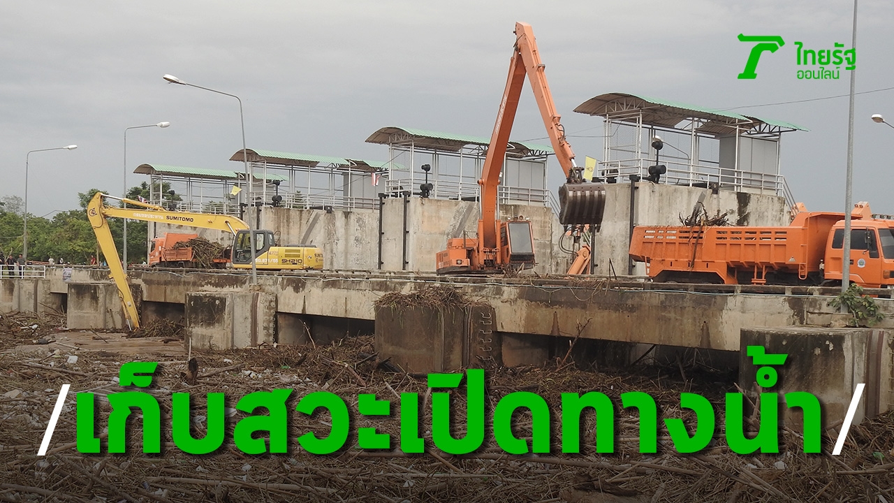 จนท.เร่งตักเศษสวะที่อัดอยู่หน้าประตูระบายน้ำบ้านหาดสะพานจันทร์ เพื่อเปิดทางให้แม่น้ำยมไหลได้ดีขึ้น ขณะที่ คันดินริมแม่น้ำยม ที่บ้านวังกุ้ง อ.เมือง พังทำน้ำทะลักท่วม ชาวบ้านเก็บของหนีอลหม่าน