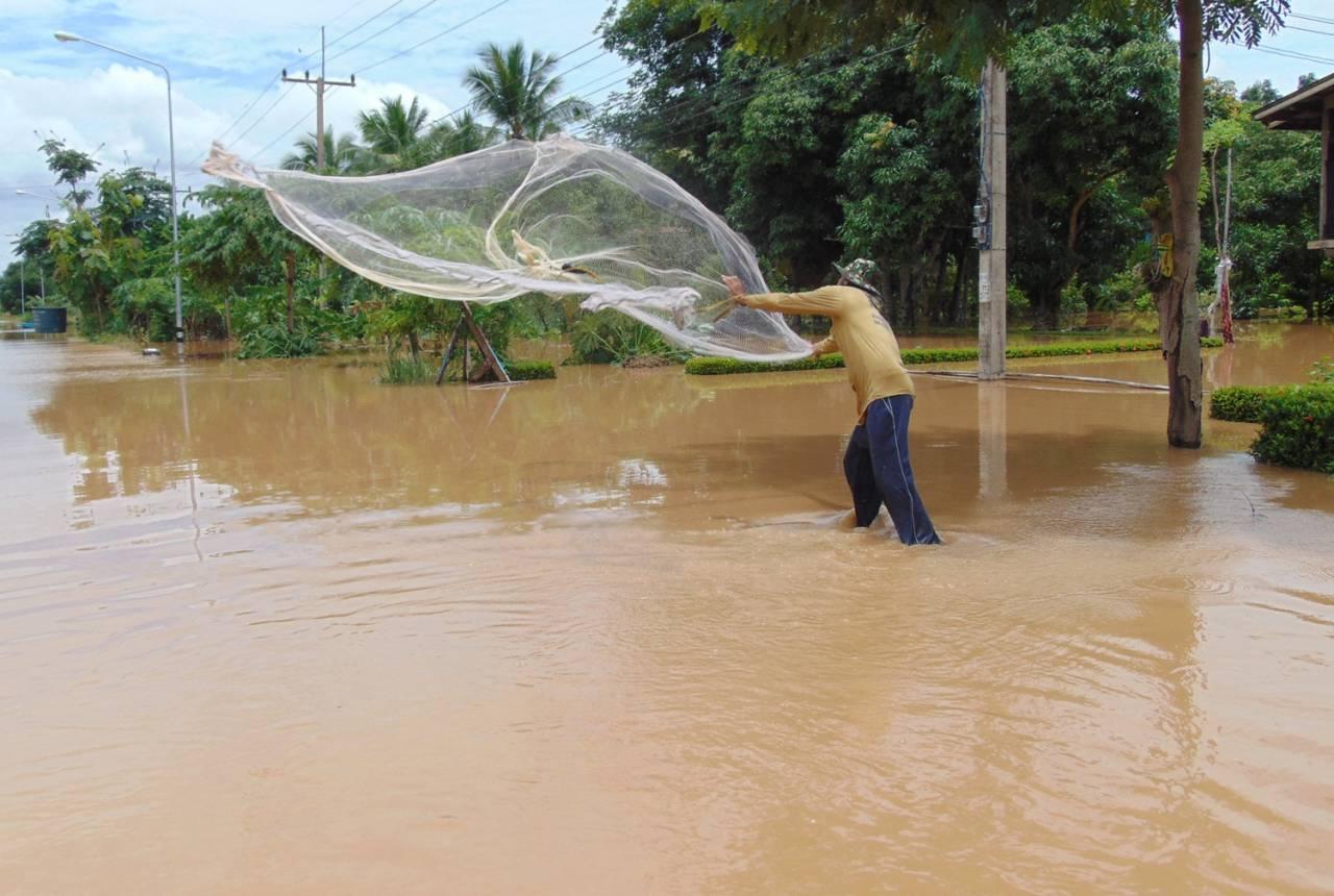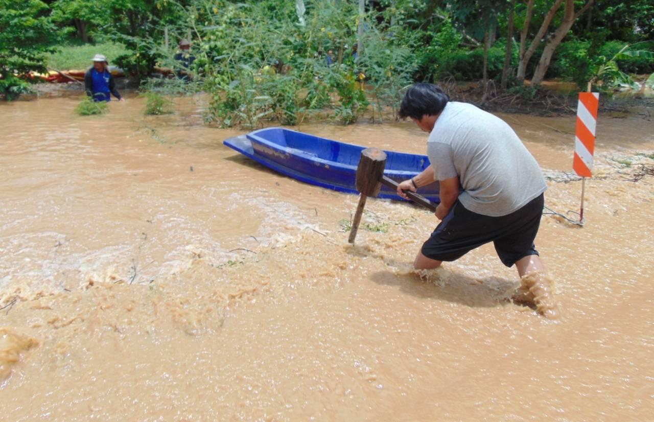 นอกจากนี้ มีรายงานว่า มวลน้ำยังได้ไหลซัดแนวคันดินริมแม่น้ำยม บริเวณ บ้านวังกุ้ง ม.6 ต.ปากพระ อ.เมืองสุโขทัย จนพังลง ทำให้กระแสน้ำไหลทะลักเข้าท่วมในพื้นที่ และลามไปจนถึง บ้านลัดทรายมูล ม.2 ต.ปากพระ อ.เมืองสุโขทัย ชาวบ้านต้องรีบขนข้าวของหนีน้ำกันอลหม่าน และนำกระสอบทรายวางกั้นเพื่อป้องกันมิให้น้ำซัดบ้านพัง นอกจากนี้ ยังมีชาวบ้านบางราย พลิกวิกฤติเป็นโอกาส ด้วยการเอาแหมายืนทอดปลา ที่ไหลมากับน้ำ บริเวณถนนสายสุโขทัย-ปากพระ ได้ปลานานาชนิดกลับไปทำกินที่บ้าน อีกด้วย.