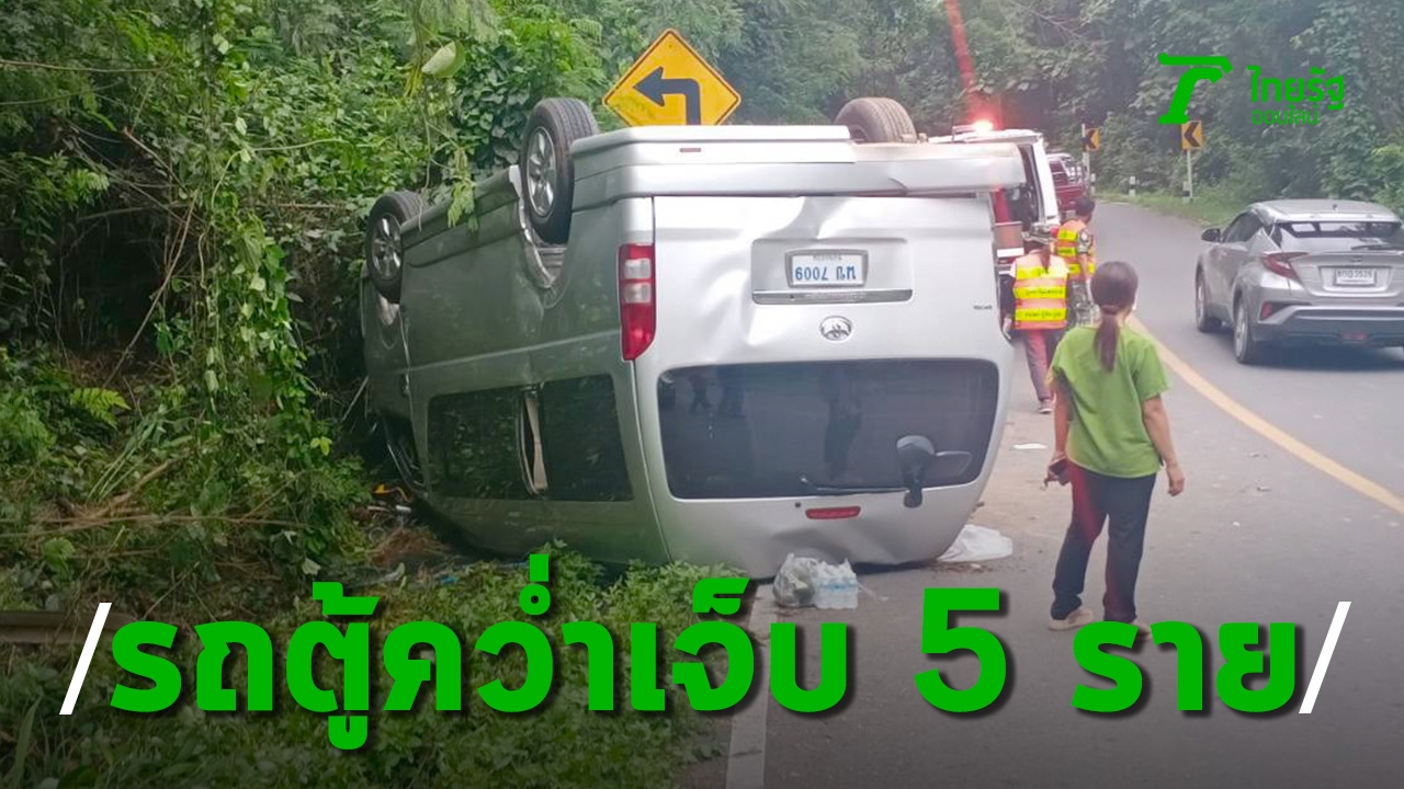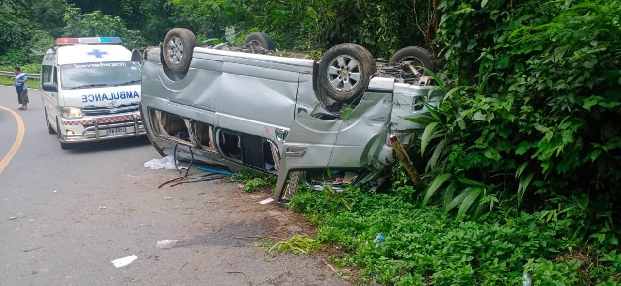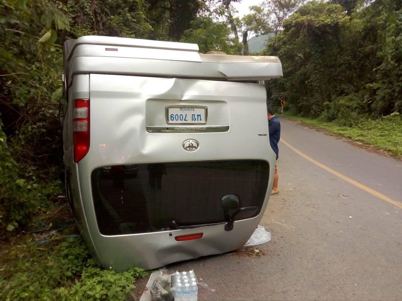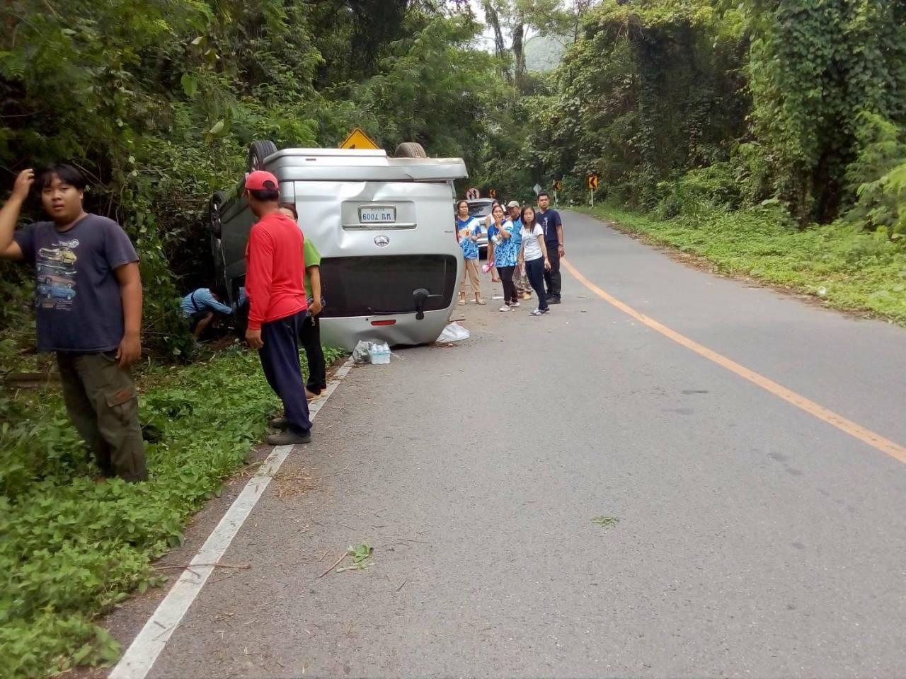 รถตู้ส่งนักท่องเที่ยวจากกาฬสินธุ์ เสียหลักแหกโค้งพลิกคว่ำล้อชี้ฟ้าบนทางลงดอยภูคา ถนนสายบ่อเกลือ-ปัว จ.น่าน หวิดตายหมู่เจ็บ 5 รายส่งโรงพยาบาลสมเด็จยุพราชปัวแล้ว เบื้องต้นคาดว่าขับรถไม่ชินทาง