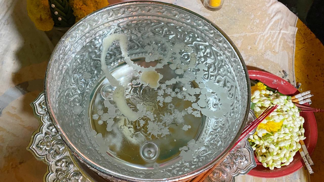 เมื่อร่างทรงประกอบพิธีหยดเทียนลงขันน้ำมนต์ ขณะทำพิธีก็มีอาการเหมือนถูกบางอย่างเข้าสิง โดยชาวบ้านเชื่อว่า "เจ้าแม่ตะเคียน" ลงมาประทับร่าง ต่างพากันฮือฮากับสิ่งที่เห็นเป็นอย่างมาก เมื่อพิธีแล้วเสร็จ คอหวยไม่รอช้าต่างพากันเข้าส่องขันน้ำมนต์ โดยเลขที่เห็นครั้งนี้ ได้แก่เลข "23, 24, 25, 29, 34, 35, 39"