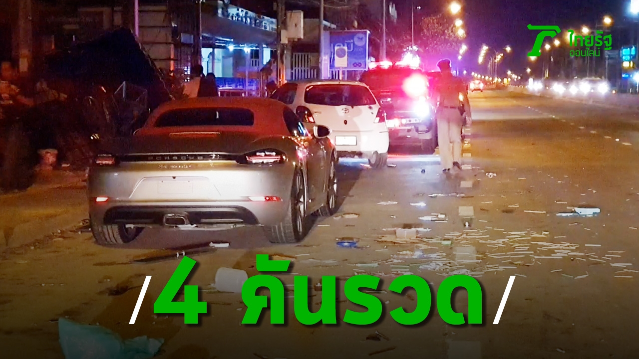 ยาริสซิ่งแซงซ้าย โผล่จ๊ะเอ๋ จยย.พ่วงข้าง เบรกไม่ทันเสยท้ายพังยับ คนขับกระเด็นเจ็บ "พอร์ช-วีออส" ตามหลัง ชนตูดซ้ำ เก๋งพังระนาว 3 คันรวด
