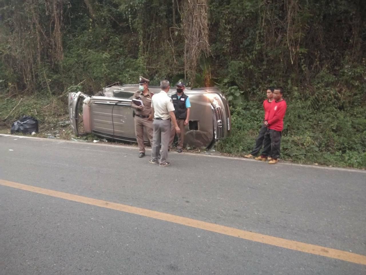 นักท่องเที่ยวขับฟอร์จูนเนอร์เสียหลักพลิกคว่ำตกเขาตรงโค้งห้วยเย็น ช่วงปัว-อช.ดอยภูคา-บ่อเกลือ จ.น่าน โชคดีเจ็บเล็กน้อย 3 ราย คนขับเผยเบรกขัดข้องทำให้รถเสียหลักพลิกคว่ำพุ่งลงร่องน้ำข้างทาง