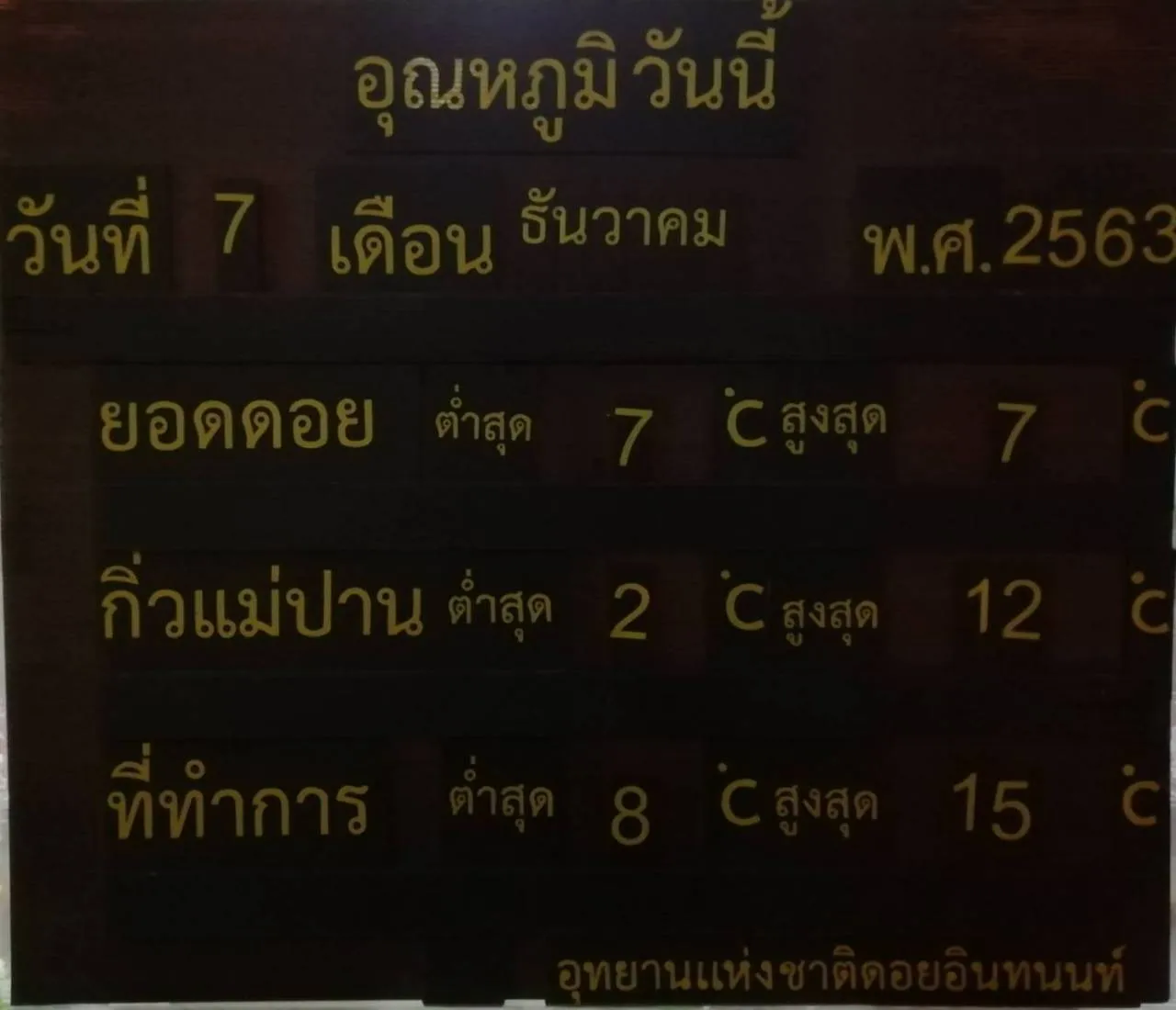 สำหรับอุณหภูมิเช้าวันนี้ลดต่ำลงอีก โดยเฉพาะที่กิ่วแม่ปานลดลงเหลือแค่ 2 องศาฯ เท่านั้น จึงนับว่าลดต่ำลงมากที่สุดของปี 2563 จึงทำให้เกิดเหมบขาบขึ้นสองวันติดดังกล่าว ขณะที่ยอดดอย 7 องศาฯ ที่ทำการอุทยานวัดได้ 8 องศาฯ