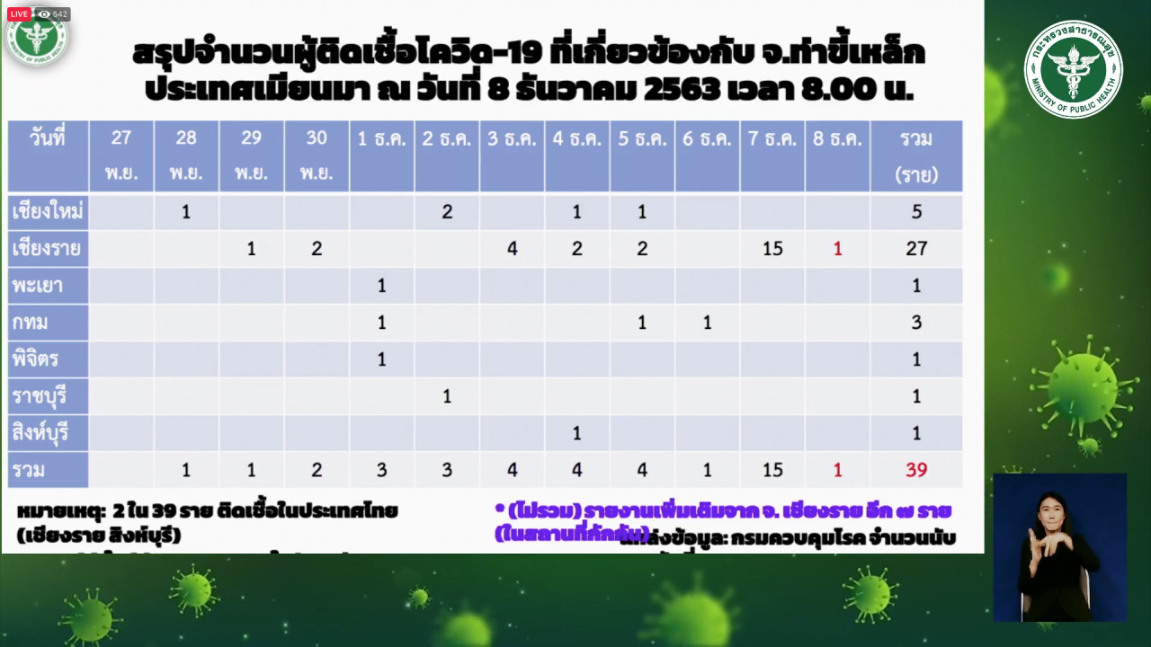 สรุปผู้เกี่ยวข้องกับ จ.ท่าขี้เหล็ก ประเทศเมียนมา ณ วันที่ 8 ธ.ค. 2563 เชียงใหม่ 1 ราย เชียงราย 27 ราย พะเยา 1 ราย กทม. 3 ราย พิจิตร 1 ราย ราชบุรี 1 ราย สิงห์บุรี 1 ราย รวม 39 ราย อย่างไรก็ตาม วันนี้มีรายงานเพิ่มเติมในส่วนของ จ.เชียงราย ติดเชื้ออีก 7 ราย โดยให้รอรายละเอียดที่ทางจังหวัดจะเป็นผู้แถลง ซึ่งไม่ได้รวมในการรายงานวันนี้