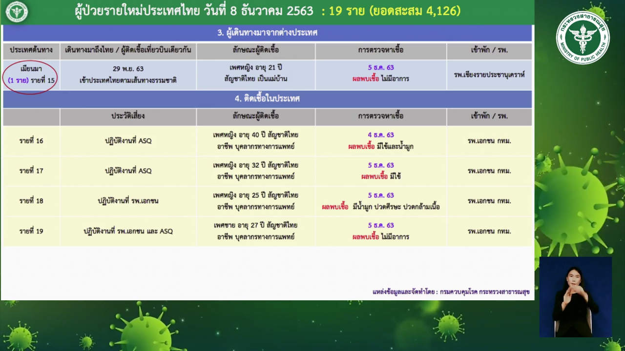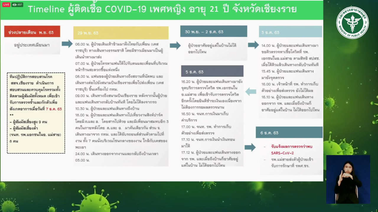 เมื่อเวลา 11.30 น. วันที่ 8 ธ.ค. 2563 นายแพทย์จักรรัฐ พิทยาวงศ์อานนท์ ผู้อำนวยการกองยุทธศาสตร์และแผนงาน กรมควบคุมโรค แถลงข่าวที่กระทรวงสาธารณสุขถึงรายละเอียดผู้ติดเชื้อโควิด-19 วันนี้ โดยมี 1 ราย เป็นทางเข้าประเทศโดยช่องทางธรรมชาติจาก จ.ท่าขี้เหล็ก ประเทศเมียนมา และเป็นเคสที่เกี่ยวข้องกับผู้ติดเชื้อ จ.ราชบุรี รายก่อนหน้านี้ที่เดินทางมาด้วยกันคือ หญิงไทยอายุ 21 ปี พบติดเชื้อโควิด-19 แต่ไม่มีอาการ ปัจจุบันรักษาอาการป่วยอยู่ที่โรงพยาบาลเชียงรายประชานุเคราะห์ โดยมีไทม์ไลน์เป็นดังนี้
