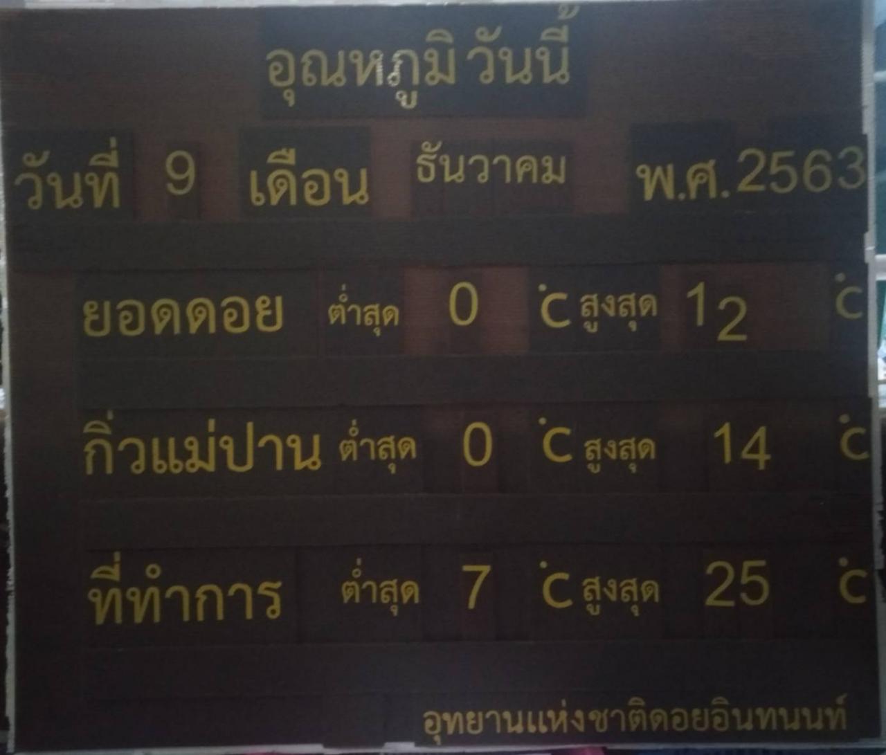 เมื่อเวลา 07.30 น. วันที่ 9 ธ.ค.63 นายเกรียงไกร ไชยพิเศษ หัวหน้าอุทยานแห่งชาติดอยอินทนนท์ อ.จอมทอง จ.เชียงใหม่ เผยว่า เช้านี้ยังมีนักท่องเที่ยวมาเที่ยวนอนกางเต็นท์สัมผัสอากาศหนาว และรอชมพระอาทิตย์ขึ้นยามเช้ากระทบกับสายหมอกงดงามมากโดยเฉพาะที่จุดชมวิวกิ่วแม่ปาน วันนี้หนาวเย็นแบบสุดขั้ว อุณหภูมิที่ 0 องศาฯ ขณะที่บนยอดดอย กิโลเมตรที่ 46 หน่วยพิทักษ์ดอยอินทนนท์ มีเหมยขาบโผล่ให้เห็นขาวโพลนเต็มไปหมด และเกาะตามดอกไม้ ยอดหญ้าเป็นเกล็ดน้ำแข็ง ท่ามกลางอุณหภูมิลดลงต่ำสุด 0 องศาฯ ส่วนที่ทำการอุทยาน 7 องศาฯ นับว่าหนาวเหน็บมาก