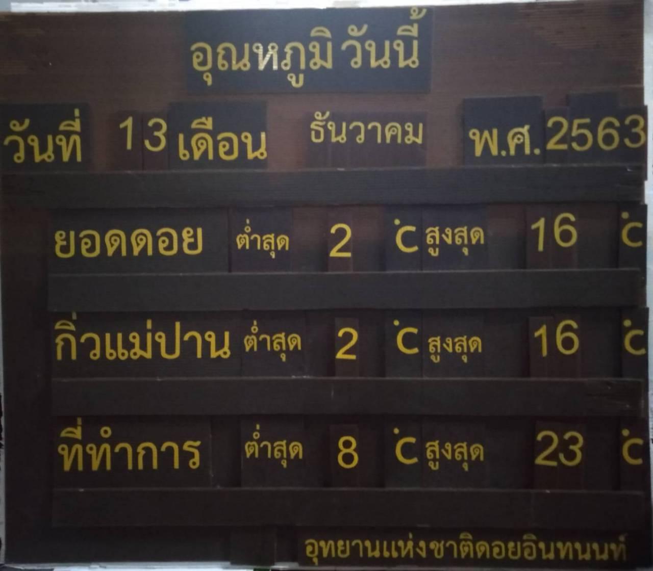 เมื่อเวลา 07.00 น. วันที่ 13 ธ.ค. 63 แม้วันนี้จะเป็นวันสุดท้ายของวันหยุดยาวติดต่อกันถึง 4 วัน นักท่องเที่ยวยังไม่หายคิดถึงบรรยากาศอันแสนเย็นสบายที่ดอยอินทนนท์ ยังคงพากันขึ้นดอยสัมผัสอากาศหนาวอย่างต่อเนื่อง ด้วยยอดนักท่องเที่ยวประมาณ 5,000 คน โดยวันนี้สามารถที่จะชมทะเลหมอกและพระอาทิตย์ขึ้นยามเช้าได้อย่างดงาม เช่นเดียวกันกับเหมยขาบที่ยังโผล่ให้เห็นติดต่อกันแบบจุใจ ไม่มีเว้นเลยช่วงนี้ เนื่องจากสภาพอากาศนั้นเย็น โดยอุณหภูมิวัดได้ต่ำสุด 2 องศาฯ ที่ยอดดอยละกิ่วแม่ปาน ส่วนที่ทำการอุทยานฯ วัดได้ 8 องศาฯ วันนี้เหมยขาบเกิดขึ้นบริเวณยอดดอยและกิโลเมตรที่ 43
