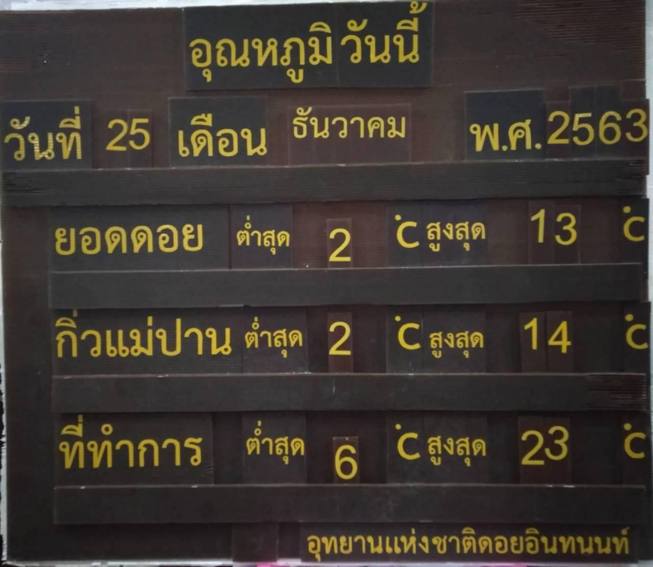ส่วนบรรยากาศที่ดอยอินทนนท์ อ.จอมทอง จ.เชียงใหม่ ซึ่งเป็นสถานที่ยอดฮิตของนักท่องเที่ยวอากาศหนาวเย็นเป็นอย่างมาก อุณหภูมิในแต่ละวันยังไม่ถึงตัวเลข 2 หลัก หนาวจนเกิดน้ำค้างแข็ง หรือเหมยขาบติดต่อกันเรื่อยมาหลายวัน ซึ่งเป็นการปรากฏการณ์ทางธรรมชาติที่ยังไม่เคยเกิดขึ้นยาวนานแบบนี้มาก่อน