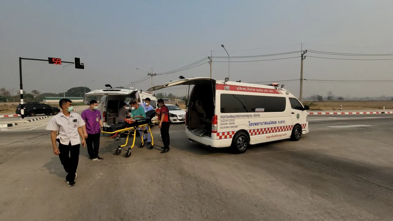 ขณะเดียวกัน ยังพบรถยนต์ตู้พยาบาลฉุกเฉินของโรงพยาบาลอำเภอพบพระ หมายเลขทะเบียน กจ 1418 ตาก จอดชนอัดติดกับรถยนต์เก๋งคู่กรณี สภาพรถด้านหน้าพังยิบเยิน ภายในรถพบตัว นายอรรถชัย ปาเป็นหลัก อายุ 28 ปี เป็นพนักงานขับรถพยาบาลฉุกเฉินไม่ได้รับบาดเจ็บ ส่วนด้านหลังรถพยาบาลพบเจ้าหน้าที่พยาบาลสาวประจำรถพยาบาลคันเกิดเหตุ กำลังช่วยเหลือผู้ป่วยสูงอายุที่นอนอยู่บนเตียงผู้ป่วยที่ยังมีสายน้ำเกลือติดอยู่ ก่อนทีมพยาบาลฉุกเฉินจากโรงพยาบาลแม่สอดที่มาเสริมในจุดเกิดเหตุ จะรีบช่วยเหลือนำตัวผู้ป่วยในรถพยาบาลอำเภอพบพระรีบส่งเข้าโรงพยาบาลแม่สอดไปพร้อมกับผู้บาดเจ็บคู่กรณีอีกสองคนอย่างเร่งด่วน