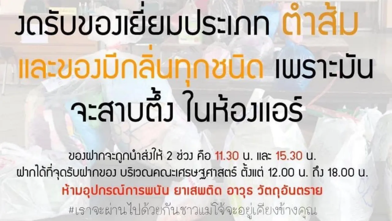 ขอไว้ก่อน ม.แม่โจ้ เชียงใหม่ ขอความร่วมมือญาติผู้ติดเชื้อโควิด งดส่งส้มตำ ทุเรียน เข้า รพ.สนาม หลังกลิ่นปลาร้าตลบอบอวลไปทั่วหอผู้ป่วย พร้อมตรวจเข้มทั้งเครื่องดื่มแอลกอฮอล์ อุปกรณ์เล่นการพนัน
