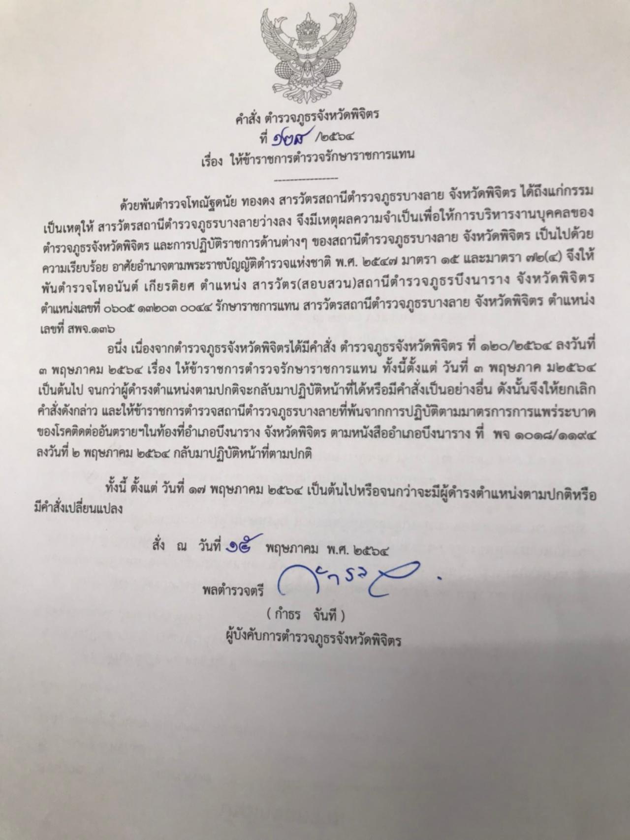 เมื่อวันที่ 15 พ.ค.64 พล.ต.ต.กำธร จันที ผบก.ภ.พิจิตร ลงนามในคำสั่งตำรวจภูธร จ.พิจิตร ที่ 1282/2564 ลงวันที่ 15 พ.ค. เรื่องให้ข้าราชการตำรวจรักษาราชการแทน ด้วย พ.ต.ท.ณัฐดนัย ทองดง สว.สภ.บางลาย จ.พิจิตร ถึงแก่กรรม เป็นเหตุให้ สว.สภ.บางลาย ว่างลง จึงให้ พ.ต.ท.อนันต์ เกียรติยศ สว.(สอบสวน) สภ.บึงนาราง จ.พิจิตร รักษาราชการแทน สว.สภ.บางลาย ตั้งแต่ 17 พ.ค. เป็นต้นไป จนกว่าจะมีคำสั่งเปลี่ยนแปลง