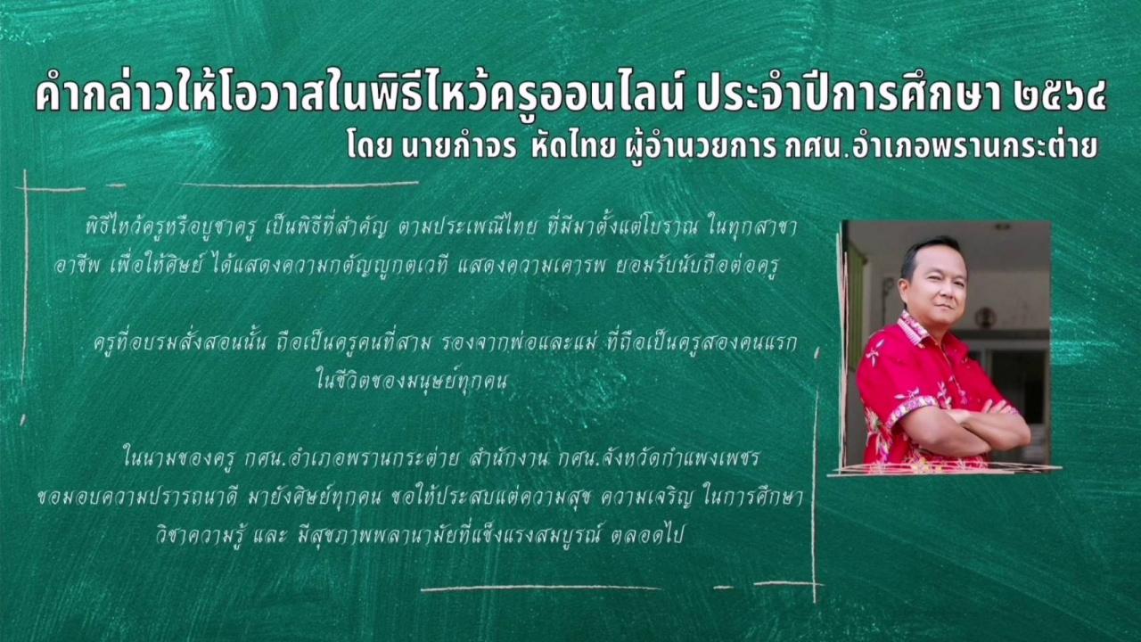 วันที่ 1 ก.ค.64 ผู้สื่อข่าวได้รับการเปิดเผยจาก "กศน.อำเภอพรานกระต่าย" สำนักงาน กศน.จังหวัดกำแพงเพชร โดยนายกำจร หัดไทย ผู้อำนวยการฯ ได้ให้ครูและบุคลากรจัดทำระบบปฏิบัติการ "พิธีไหว้ครู Online ประจำปี 2564" กศน.อำเภอพรานกระต่าย โดยเริ่มวันพฤหัสบดีที่ 1 กรกฎาคม 2564 เป็นต้นไป ถึงวันที่ 8 กรกฎาคม 2564 ซึ่งนักศึกษา กศน.สามารถเข้าใช้ได้ทั้งศิษย์ปัจจุบัน และศิษย์เก่า