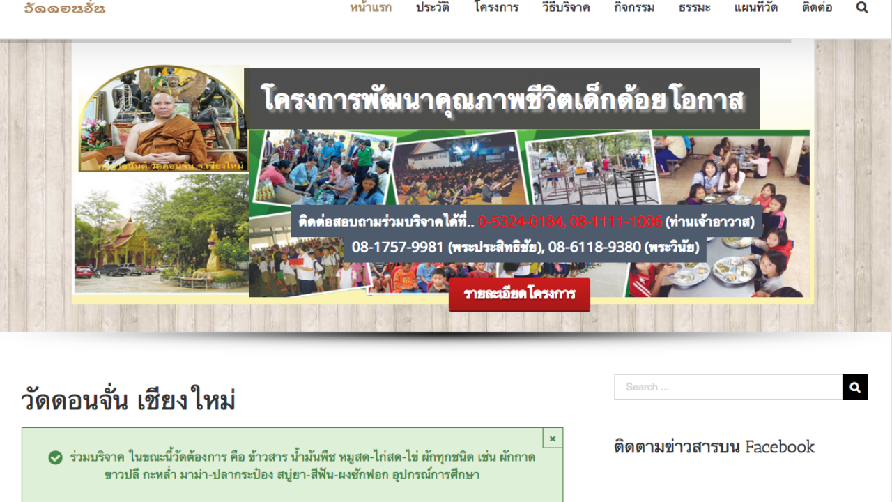 ทั้งนี้ ผู้มีจิตศรัทธาสามารถบริจาคข้าวสาร อาหารสดและอาหารแห้งได้ที่วัดดอนจั่นโดยตรง หรือส่งมาวัดดอนจั่น เลขที่ 2 หมู่ 4 ต.ท่าศาลา อ.เมือง จ.เชียงใหม่ รหัสไปรษณีย์ 50000 หรือร่วมบริจาคเงิน ผ่านบัญชีเดินสะพัดธนาคารไทยพาณิชย์ เลขที่ 664-301462-6 ชื่อบัญชี วัดดอนจั่นเพื่อโครงการเด็กด้อยโอกาส สาขาสี่แยกสันกําแพง ข้อมูลเพิ่มเติมติดต่อสอบถามโทรศัพท์ 053 240 184 หรือไลน์ไอดี 082 228 8542.