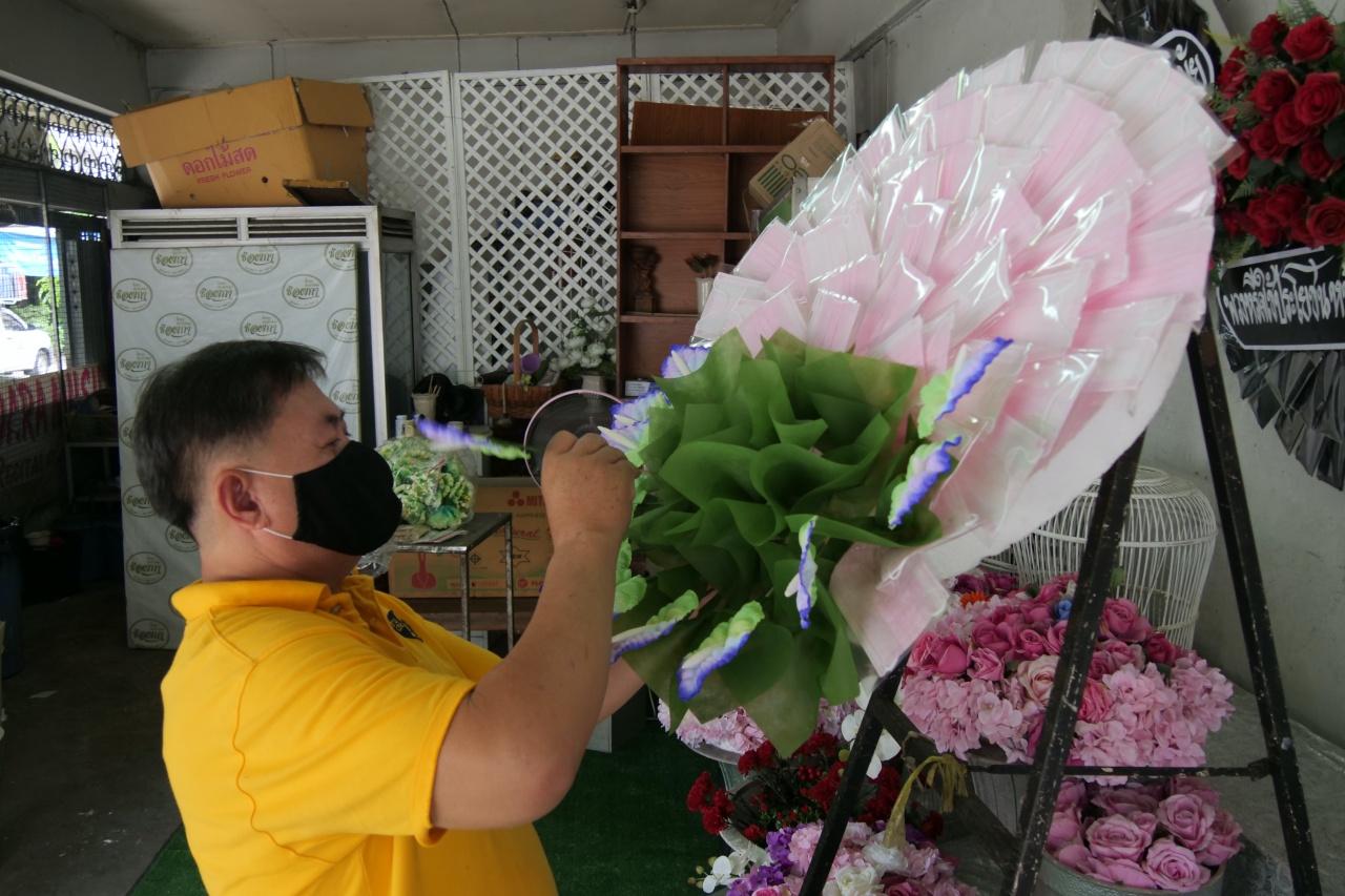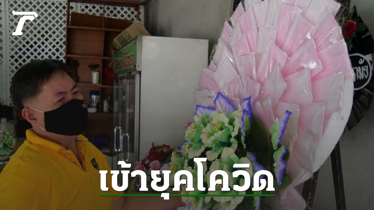 วันที่ 19 สิงหาคม นายทวี พรหมทา อายุ 50 ปี ร้านดอกไม้ช่อผกา บริเวณแยกสันป่าข่อย ต.วัดเกต อ.เมืองเชียงใหม่ นำหน้ากากอนามัยแยกชิ้นมาบรรจุซองพลาสติกและติดไม้เสียบลงไปบนแผ่นโฟม ก่อนจะใช้ดอกไม้กระดาษหลากสีสันตกแต่งเพิ่มเติม กลายเป็นพวงหรีดหน้ากากอนามัยที่มีความสวยงาม พร้อมส่งมอบให้กับลูกค้าที่สั่งไว้