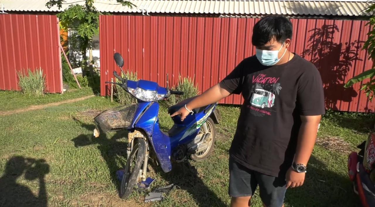 ด้าน นายวทัญญู หมู่แก้วเครือ อายุ 20 ปี คนขี่รถ จยย.คู่กรณีคันที่ถูกเก๋งแดงเฉี่ยวชน เปิดเผยนาทีชีวิตว่า ตนเองกำลังขี่ จยย.มาตามเส้นทางปกติเพื่อที่จะกลับบ้าน เมื่อถึงที่เกิดเหตุซึ่งเป็นทางโค้ง จู่ๆ รถเก๋งแดงคันดังกล่าวก็พุ่งเข้ามาชนรถ จยย.ของตนเอง ทำให้รถล้มได้รับบาดเจ็บ ส่วนรถเก๋งแดงก็ขับเป๋ไปเล็กน้อย ก่อนที่จะไปจอด แล้วคนขับรถยังลงมาด่าตนเองว่าขี่รถ จยย.ไปชนเขา ก่อนที่ชายคนดังกล่าวจะขับรถเก๋งแดงออกไป ตนเองจึงโทรแจ้งพี่สาวและตำรวจจนสามารถไปจับกุมตัวชายคนดังกล่าวได้ที่อีกหมู่บ้านหนึ่งห่างจากจุดเกิดเหตุประมาณ 2-3 กม. เพราะเนื่องจากน้ำมันรถเก๋งแดงหมด ทั้งนี้รถของตนเองได้รับความเสียหายอย่างหนัก ส่วนคู่กรณีเท่าที่ทราบช่วงขณะเกิดเหตุ อาจจะเมาและคนขับรถคันที่ก่อเหตุเป็นคนเร่ร่อนกินนอนในรถ เพราะเห็นมีเสื้อผ้าอยู่ที่หลังรถเต็มไปหมด ตอนนี้นอกจากเจ็บตัวแล้วยังกลุ้มใจเรื่องค่าเสียหายอีก