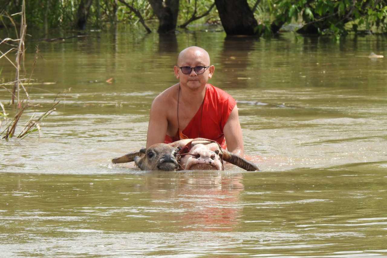 น้ำท่วมสุโขทัยที่วัดพลายชุมพล บ้านหางคลอง ม.5 ต.บ้านกล้วย อ.เมือง น้ำสูงกว่า 1.5 เมตร ทำให้ต้องพาฝูงควายเผือกของวัดทั้ง 6 ตัวหนีขึ้นที่สูง ด้าน ปศุสัตว์ รุดช่วยมอบหญ้าแห้งเป็นการเบื้องต้น